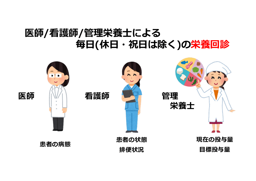 #26. 医師/看護師/管理栄養⼠による 毎⽇(休⽇・祝⽇は除く)の栄養回診 医師 看護師 患者の病態 管理 栄養⼠ 患者の状態 現在の投与量 排便状況 ⽬標投与量