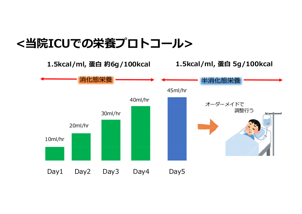 #27. <当院ICUでの栄養プロトコール> 1.5kcal/ml, 蛋⽩ 約6g/100kcal 1.5kcal/ml, 蛋⽩ 5g/100kcal 消化態栄養 半消化態栄養 45ml/hr 40ml/hr オーダーメイドで 調整⾏う 30ml/hr 20ml/hr 10ml/hr Day1 Day2 Day3 Day4 Day5