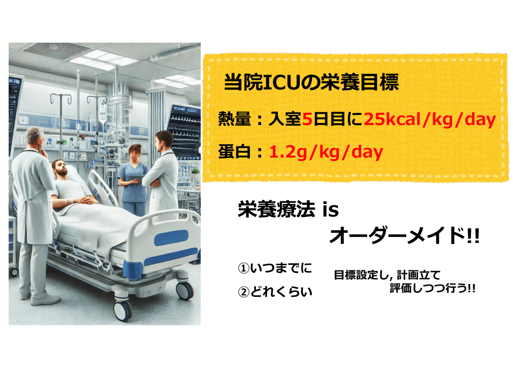 #28. 当院ICUの栄養⽬標 熱量︓⼊室5⽇⽬に25kcal/kg/day 蛋⽩︓1.2g/kg/day 栄養療法 is オーダーメイド!! ①いつまでに ②どれくらい ⽬標設定し, 計画⽴て 評価しつつ⾏う!!