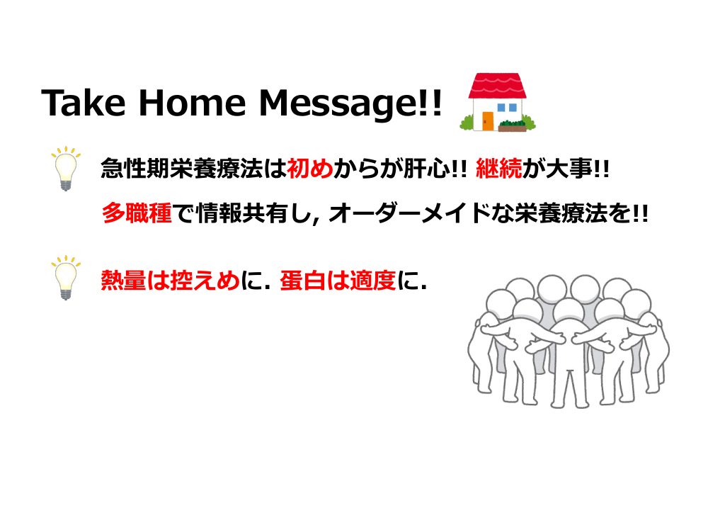 #29. Take Home Message!! 急性期栄養療法は初めからが肝⼼!! 継続が⼤事!! 多職種で情報共有し, オーダーメイドな栄養療法を!! 熱量は控えめに. 蛋⽩は適度に.