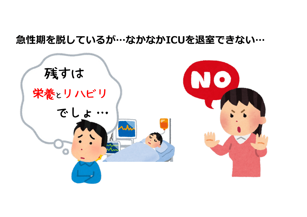 #3. 急性期を脱しているが…なかなかICUを退室できない… 残すは 栄養とリハビリ でしょ… いや 急 で 性し 期ょ ‼ いや