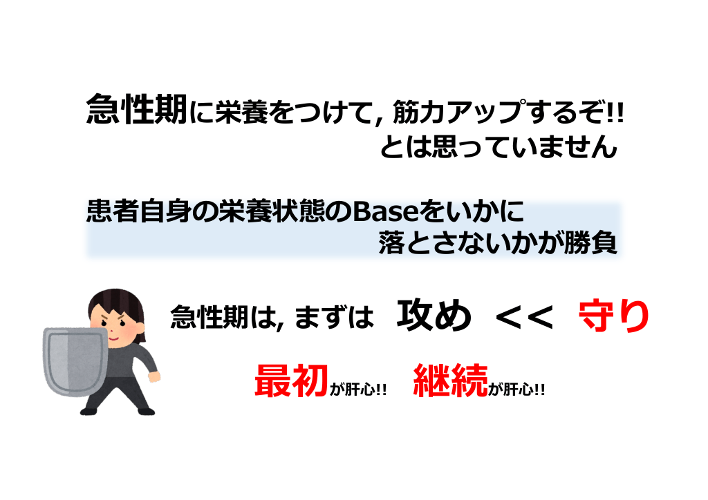 #4. 急性期に栄養をつけて, 筋⼒アップするぞ!! とは思っていません 患者⾃⾝の栄養状態のBaseをいかに 落とさないかが勝負 急性期は, まずは 攻め << 守り 最初が肝⼼!! 継続が肝⼼!!