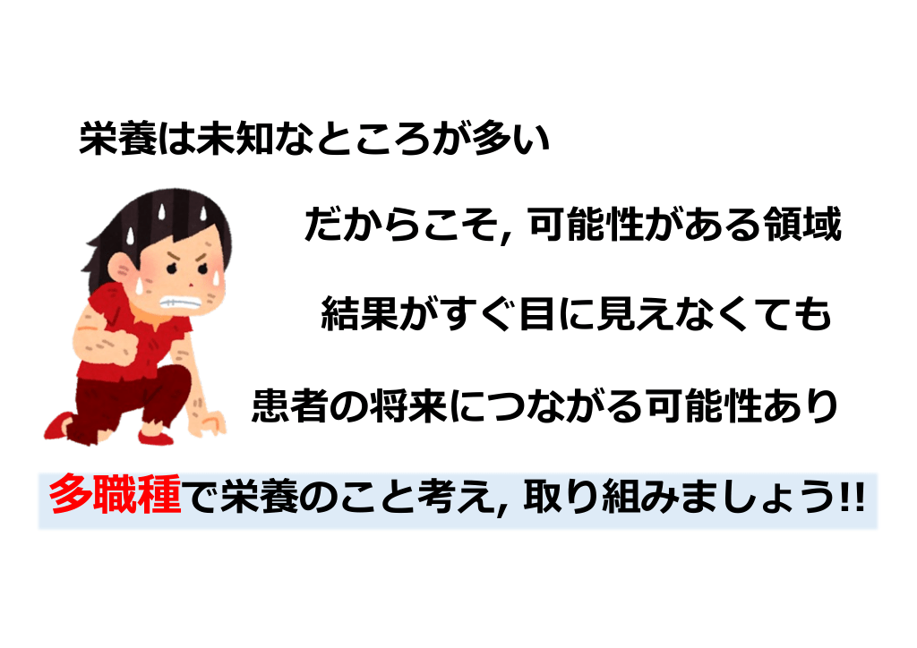 #7. 栄養は未知なところが多い だからこそ, 可能性がある領域 結果がすぐ⽬に⾒えなくても 患者の将来につながる可能性あり 多職種で栄養のこと考え, 取り組みましょう!!