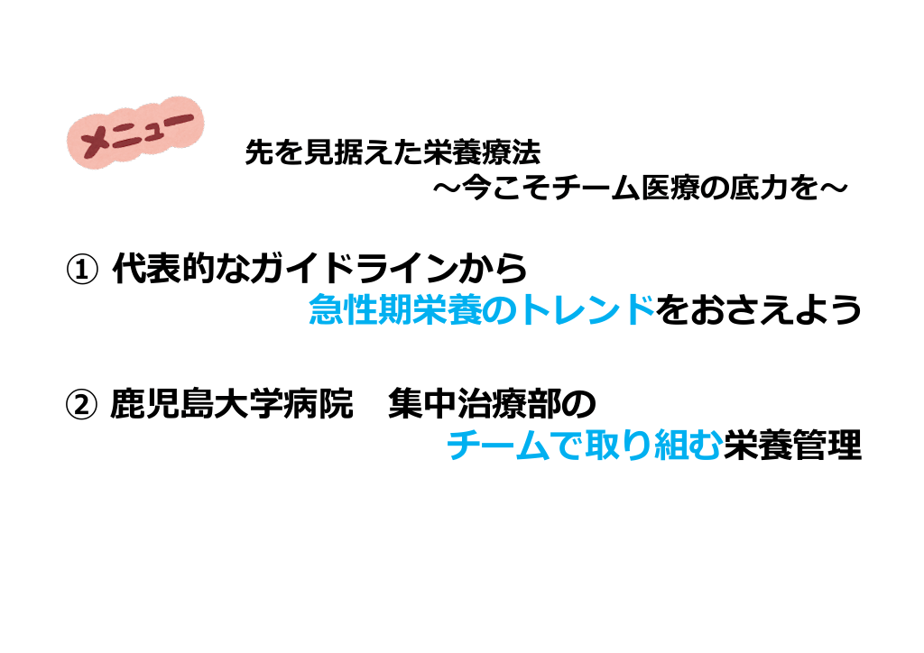 #8. 先を⾒据えた栄養療法 〜今こそチーム医療の底⼒を〜 ① 代表的なガイドラインから 急性期栄養のトレンドをおさえよう ② ⿅児島⼤学病院 集中治療部の チームで取り組む栄養管理