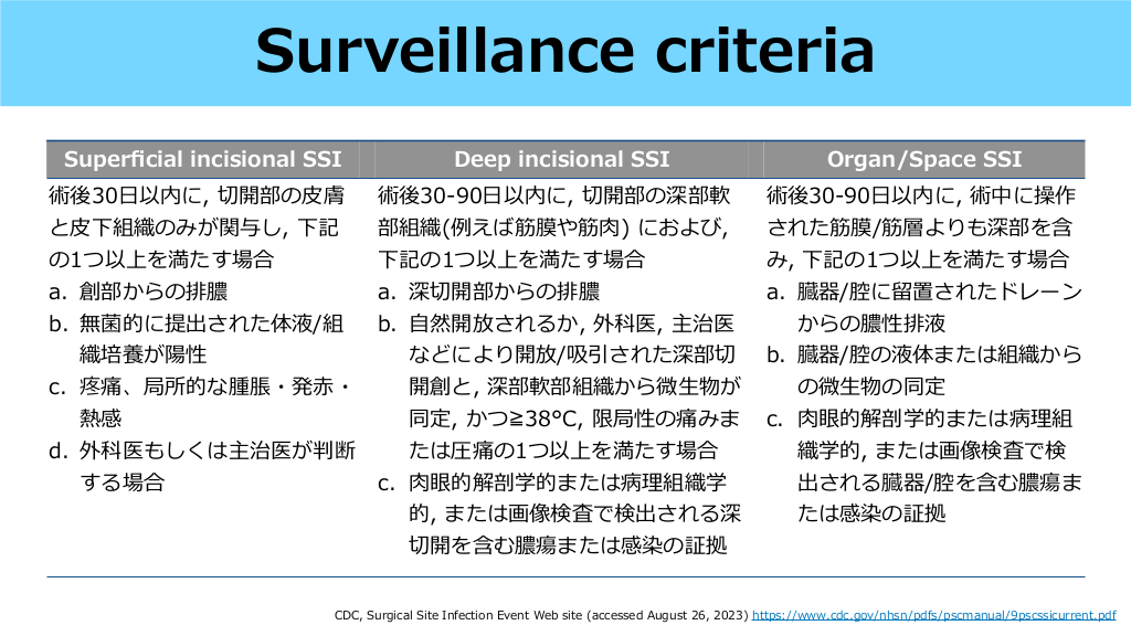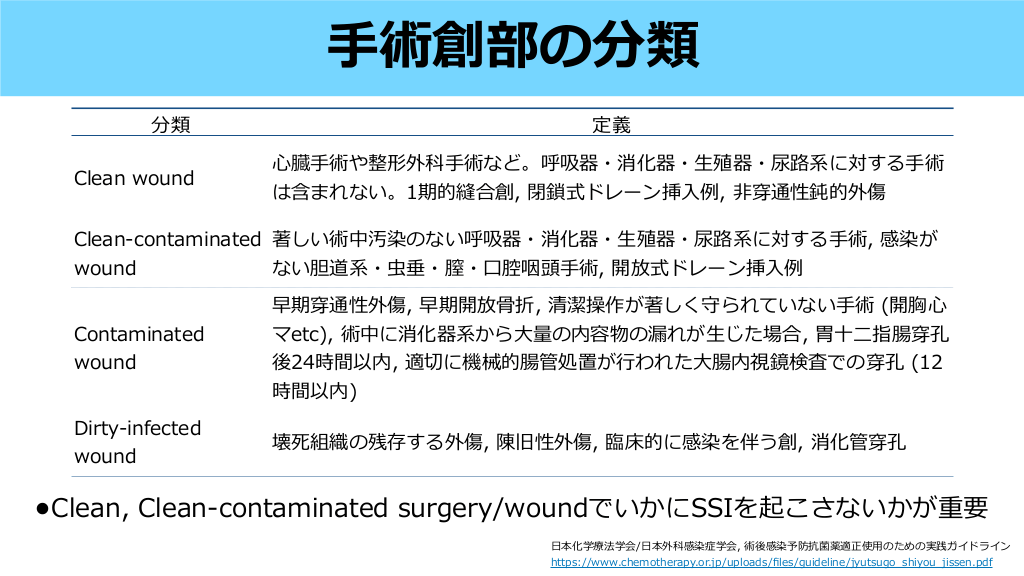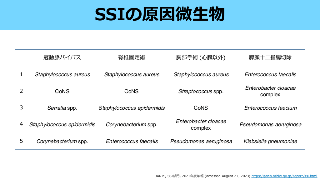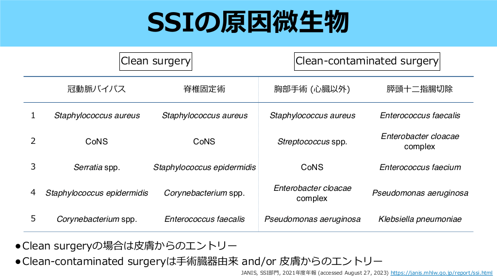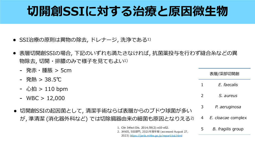 SSIは深達度で分ける • 表層:表 • 深層:筋膜〜筋 • 臓器体腔:さらに奥 〜 下組織 肉 皮 皮 Infect Control Hosp Epidemiol. 1992;13(10):606-608. #10. Super cial incisional SSI Deep incisional SSI Organ/Space SSI 術後30 以内に, 切開部の 膚 と 下組織のみが関与し, 下記 の1つ以上を満たす場合 a. 創部からの排膿 b. 無菌的に提出された体液/組 織培養が陽性 c. 疼痛、局所的な腫脹・発 ・ 熱感 d. 外科医もしくは主治医が判断 する場合 術後30-90 以内に, 切開部の深部軟 部組織(例えば筋膜や筋 ) におよび, 下記の1つ以上を満たす場合 a. 深切開部からの排膿 b. 然開放されるか, 外科医, 主治医 などにより開放/吸引された深部切 開創と, 深部軟部組織から微 物が 同定, かつ≧38°C, 限局性の痛みま たは圧痛の1つ以上を満たす場合 c. 眼的解剖学的または病理組織学 的, または画像検査で検出される深 切開を含む膿瘍または感染の証拠 術後30-90 以内に, 術中に操作 された筋膜/筋層よりも深部を含 み, 下記の1つ以上を満たす場合 a. 臓器/腔に留置されたドレーン からの膿性排液 b. 臓器/腔の液体または組織から の微 物の同定 c. 眼的解剖学的または病理組 織学的, または画像検査で検 出される臓器/腔を含む膿瘍ま たは感染の証拠 生 皮 赤 肉 日 日 日 fi 生 CDC, Surgical Site Infection Event Web site (accessed August 26, 2023) https://www.cdc.gov/nhsn/pdfs/pscmanual/9pscssicurrent.pdf 皮 自 肉 肉 Surveillance criteria #11. SSIの原因微 物 1 冠動脈バイパス 脊椎固定術 胸部 Staphylococcus aureus Staphylococcus aureus 術( 臓以外) 膵頭 指腸切除 Staphylococcus aureus Enterococcus faecalis 2 CoNS CoNS Streptococcus spp. Enterobacter cloacae complex 3 Serratia spp. Staphylococcus epidermidis CoNS Enterococcus faecium Pseudomonas aeruginosa Klebsiella pneumoniae 4 Staphylococcus epidermidis Corynebacterium spp. Enterobacter cloacae complex 5 Corynebacterium spp. Enterococcus faecalis Pseudomonas aeruginosa 生 心 門 二 手 十 JANIS, SSI部 , 2021年度年報 (accessed August 27, 2023) https://janis.mhlw.go.jp/report/ssi.html SSIの治療原則とNPWTの効果 #12. SSIの原因微 物 Clean surgery 1 Clean-contaminated surgery 冠動脈バイパス 脊椎固定術 胸部 Staphylococcus aureus Staphylococcus aureus 術( 臓以外) 膵頭 指腸切除 Staphylococcus aureus Enterococcus faecalis 2 CoNS CoNS Streptococcus spp. Enterobacter cloacae complex 3 Serratia spp. Staphylococcus epidermidis CoNS Enterococcus faecium Pseudomonas aeruginosa Klebsiella pneumoniae 4 Staphylococcus epidermidis Corynebacterium spp. Enterobacter cloacae complex 5 Corynebacterium spp. Enterococcus faecalis Pseudomonas aeruginosa • Clean surgeryの場合は 膚からのエントリー • Clean-contaminated surgeryは 術臓器由来 and/or 膚からのエントリー 皮 手 生 皮 心 門 二 手 十 JANIS, SSI部 , 2021年度年報 (accessed August 27, 2023) https://janis.mhlw.go.jp/report/ssi.html #13. • SSI治療の原則は異物の除去, ドレナージ, 洗浄である1) • 表層切開創SSIの場合, 下記のいずれも満たさなければ, 抗菌薬投与を 物除去, 切開・排膿のみで様 を てもよい1) • 発 わず縫合 ・腫脹 > 5cm 発熱 > 38.5℃ 拍 > 110 bpm WBC > 12,000 切開創SSIの起因菌として, 清潔 術ならば表層からのブドウ球菌が多い が, 準清潔 (消化器外科など) では切除臓器由来の細菌も原因となりえる2) 糸 生 行 見 手 子 門 などの異 表層/深部切開創 1. Clin Infect Dis. 2014;59(2):e10-e52. 2. JANIS, SSI部 , 2021年度年報 (accessed August 27, 2023) https://janis.mhlw.go.jp/report/ssi.html 赤 心 切開創SSIに対する治療と原因微 物 1 E. faecalis 2 S. aureus 3 P. aeruginosa 4 E. cloacae complex 5 B. fragilis group #14.