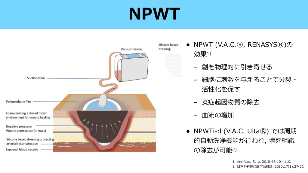 • NPWT (V.A.C.Ⓡ, RENASYSⓇ)の 効果1) - 創を物理的に引き寄せる - 細胞に刺激を与えることで分裂・ 活性化を促す - 炎症起因物質の除去 • 流の増加 NPWTi-d (V.A.C. UltaⓇ) では周期 的 動洗浄機能が われ, 壊死組織 の除去が可能2) 行 1. Ann Vasc Surg. 2018;48:104-110. 2. 本外科感染症学会雑誌. 2020;17(1):27-32 自 血 日 NPWT NPWTの適応と効果 #15.