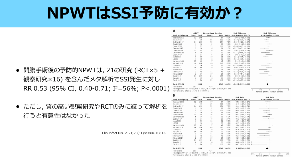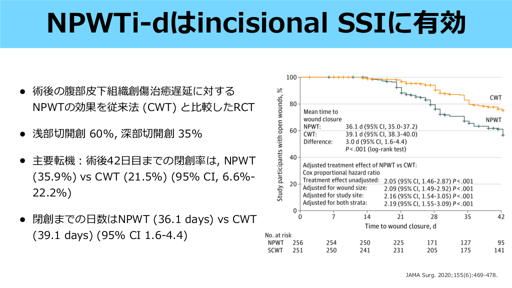 • 開腹 術後の予防的NPWTは, 21の研究 (RCT×5 + 観察研究×16) を含んだメタ解析でSSI発 に対し RR 0.53 (95% CI, 0.40-0.71; I2=56%; P<.0001) • ただし, 質の い観察研究やRCTのみに絞って解析を うと有意性はなかった 生 高 Clin Infect Dis. 2021;73(11):e3804-e3813. 手 行 NPWTはSSI予防に有効か? #16. • 各領域の切開創SSIハイリスク症例, 創分類, 基礎疾患に応じてSSI1次予防の適応あり1) • 禁忌として, 主要な 管・臓器・神経が露出している創傷, 管吻合部, 臓器と交通して いる瘻孔, 髄液瘻・消化管瘻・肺瘻, 痂 を伴う壊死組織を除去していない創傷, 壊死 が除去されていない 髄炎, 悪性腫瘍がある創傷が挙げられる2) • NPWTでは壊死組織の残存している感染創には禁忌とされていたが, NPWTi-dでは洗浄 液が 定時間創部を浸し壊死組織を軟化させ, 陰圧治療により除去されるため, 中等度の 感染創には使 可能3) 1. 本外科感染症学会, 切開創SSIに対するNPWT機器の適正使 http://www.gekakansen.jp/pdf/NPWT_jssi.pdf にかかる提 (2019年8 23 ) 2. RENASYS創傷治療システム, 添付 書 (2022年11 改訂第3版) https://www.info.pmda.go.jp/ down les/md/PDF/371113/371113_22400BZX00276000_A_02_03.pdf 骨 本外科感染症学会雑誌. 2020;17(1):27-32 血 日 月 皮 言 用 月 骨 血 文 用 一 3. fi 日 日 適応 #17.