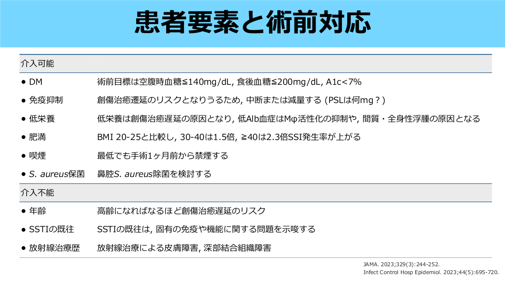 介 可能 • DM 術前 • 免疫抑制 創傷治癒遷延のリスクとなりうるため, 中断または減量する (PSLは何mg?) • 低栄養 低栄養は創傷治癒遅延の原因となり, 低Alb • 肥満 BMI 20-25と • 喫煙 最低でも • S. aureus保菌 介 標は空腹時 糖≦140mg/dL, 後 糖≦200mg/dL, A1c<7% 症はMφ活性化の抑制や, 間質・全 較し, 30-40は1.5倍, ≧40は2.3倍SSI発 性浮腫の原因となる 率が上がる 術1ヶ 前から禁煙する 腔S. aureus除菌を検討する 不能 • 年齢 • SSTIの既往 SSTIの既往は, 固有の免疫や機能に関する問題を • 放射線治療歴 放射線治療による 齢になればなるほど創傷治癒遅延のリスク 唆する 膚障害, 深部結合組織障害 JAMA. 2023;329(3):244-252. 身 生 示 血 血 食 血 皮 月 比 手 目 入 Infect Control Hosp Epidemiol. 2023;44(5):695-720. 入 鼻 高 患者要素と術前対応 術中の感染予防対策 #21.