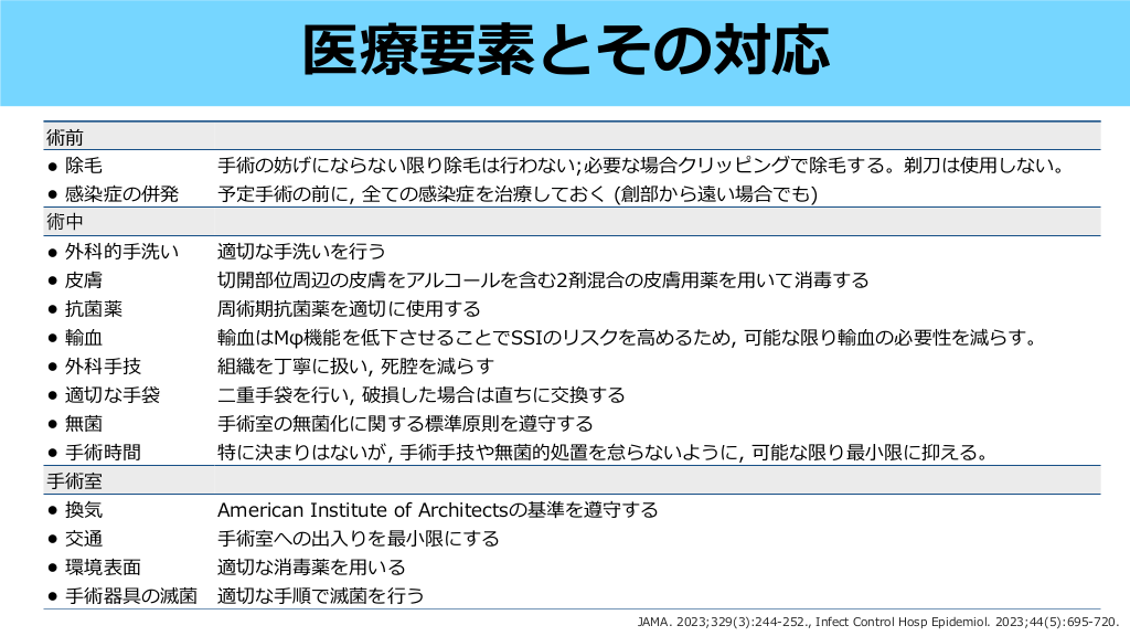 術前 •除 術の妨げにならない限り除 • 感染症の併発 術中 予定 • • • • • • • • 適切な 外科的 洗い 膚 洗いを 膚をアルコールを含む2剤混合の 膚 周術期抗菌薬を適切に使 輸 輸 技 わない;必要な場合クリッピングで除 する。剃 は使 しない。 う 切開部位周辺の 外科 は 術の前に, 全ての感染症を治療しておく (創部から遠い場合でも) 抗菌薬 薬を いて消毒する する はMφ機能を低下させることでSSIのリスクを めるため, 可能な限り輸 の必要性を減らす。 組織を丁寧に扱い, 死腔を減らす 適切な 袋 重 無菌 袋を い, 破損した場合は直ちに交換する 術室の無菌化に関する標準原則を遵守する 術時間 特に決まりはないが, 術 技や無菌的処置を怠らないように, 可能な限り最 限に抑える。 術室 換気 American Institute of Architectsの基準を遵守する 交通 術室への出 環境表 りを最 適切な消毒薬を 術器具の滅菌 適切な 限にする いる 順で滅菌を う 用 刀 小 血 毛 用 用 皮 高 行 毛 手 用 小 手 行 行 皮 用 入 JAMA. 2023;329(3):244-252., Infect Control Hosp Epidemiol. 2023;44(5):695-720. 行 手 手 手 面 手 手 手 手 毛 血 • • • • 血 手 皮 二 手 手 手 手 手 医療要素とその対応 #22.