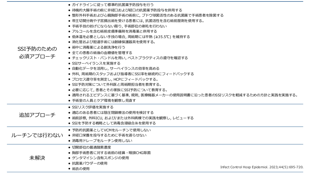 • • • 予防的抗菌薬としてVCMをルーチンで使 しない 経 栄養を投与するために 術を遅らせない 消毒 ドレープをルーチン使 しない • • • • • 切開部位の最適酸素濃度 胸部 術患者に対する術前の経 ・咽頭CHG除菌 ゲンタマイシン含有スポンジの使 抗菌薬パウダーの使 されるエビデンスに基づく基準, 規則, 医療機器メーカーの使 術室の 員とケア環境を観察し 直す 説明書に沿った患者のSSIリスクを軽減するための 針と実践を実施する。 Infect Control Hosp Epidemiol. 2023;44(5):695-720. 方 手 用 用 用 行 の使 高 行 術 用 用 糸 口 用 見 用 手 鼻 手 行 用 手 用 口 非 皮 手 心 血 用 行 手 用 子 手 手 人 用 大 手 口 用 手 用 未解決 SSIリスク評価を実施する 適応のある患者には陰圧閉鎖療法の使 を検討する 術前診察, 外科ICU, および/または外科病棟での実践を観察し, レビューする SSIを予防する戦略として消毒含浸縫合 を使 する 適 毛 わない • • • • する 整形外科 術および 臓胸部 術の術前に, ブドウ球菌活性のある抗菌薬で 術患者を除菌する 帝王切開分娩や 宮摘出術を受ける患者には, 抗菌活性を含む術前腟剤を使 する。 術 技の妨げにならない限り, 術部位の剃 を わない アルコールを含む術前 膚準備剤を消毒薬と併 する 低体温を必要としない 技の場合, 周術期には平熱 (≧35.5℃) を維持する 消化管および胆道 術には創縁保護器具を使 する。 術中に消毒薬による創洗浄を う 全ての患者の術後の 糖値を管理する チェックリスト・バンドルを い, ベストプラクティスの遵守を確認する SSIサーベイランスを実施する 動化データを活 し, サーベイランスの効率を める 外科, 周術期のスタッフおよび指導者にSSI率を継続的にフィードバックする プロセス遵守率を測定し, HCPにフィードバックする。 SSI予防対策について外科医と周術期担当者を教育する。 必要に応じて, 患者とその家族にSSI予防について教育する。 用 ルーチンでは #23.