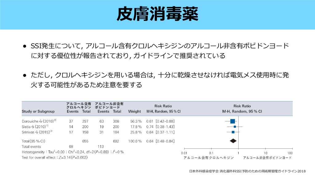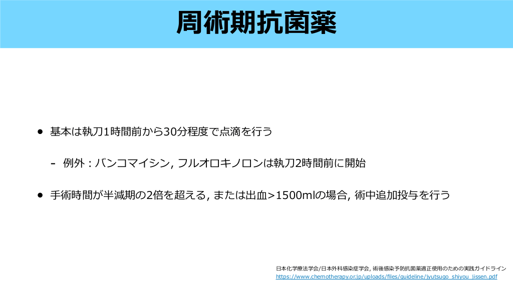 • メタ解析でイソジン系消毒薬に対してSSI発 率を下げる効果が確認されたのは2.02.5%CHG (RR 0.75, 95%CI 0.61-0.92) と1.5%オラネジンのみ (RR 0.49, 95%CI 0.26-0.92) • 0.5%CHGはRR 0.69 (95%CI 0.47-1.02) と有意差はないがSSIが減る傾向にあった • • 本で いることができる最 濃度の1%CHGに関しては解析なし clean surgeryの場合は, CHGは濃度によらずイソジン系消毒薬と 果が い (RR 0.6, 95%CI 0.36-0.99) 較しSSI発 予防効 生 比 生 大 用 Lancet Microbe. 2022;3(10):e762-e771. 高 日 CHG濃度 #25. • 基本は執 • 1時間前から30分程度で点滴を う 例外:バンコマイシン, フルオロキノロンは執 術時間が半減期の2倍を超える, または出 2時間前に開始 >1500mlの場合, 術中追加投与を 本化学療法学会/ 本外科感染症学会, 術後感染予防抗菌薬適正使 う のための実践ガイドライン 行 刀 血 行 用 fi 日 https://www.chemotherapy.or.jp/uploads/ les/guideline/jyutsugo_shiyou_jissen.pdf 刀 手 日 周術期抗菌薬 #26.