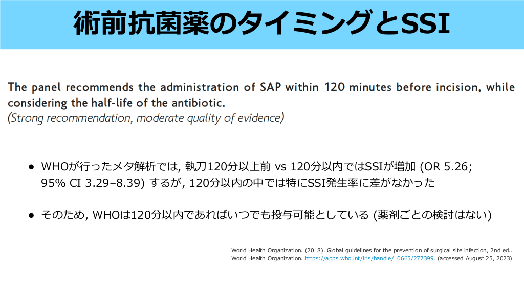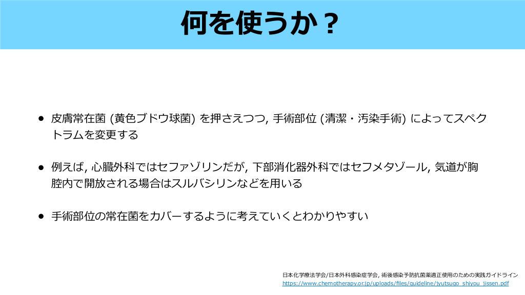 術前抗菌薬のタイミングとSSI Ann Surg. 2009;250(1):10-16. MRSAスクリーニングと抗菌薬 #27. 術前抗菌薬のタイミングとSSI • WHOが ったメタ解析では, 執 120分以上前 vs 120分以内ではSSIが増加 (OR 5.26; 95% CI 3.29–8.39) するが, 120分以内の中では特にSSI発 率に差がなかった • そのため, WHOは120分以内であればいつでも投与可能としている (薬剤ごとの検討はない) 生 刀 行 World Health Organization. (2018). Global guidelines for the prevention of surgical site infection, 2nd ed.. World Health Organization. https://apps.who.int/iris/handle/10665/277399 . (accessed August 25, 2023) #28. • 膚常在菌 ( ブドウ球菌) を押さえつつ, トラムを変更する • 例えば, 臓外科ではセファゾリンだが, 下部消化器外科ではセフメタゾール, 気道が胸 腔内で開放される場合はスルバシリンなどを いる • 術部位 (清潔・汚染 術) によってスペク 術部位の常在菌をカバーするように考えていくとわかりやすい 本化学療法学会/ 本外科感染症学会, 術後感染予防抗菌薬適正使 のための実践ガイドライン 手 手 用 用 fi 色 黄 日 https://www.chemotherapy.or.jp/uploads/ les/guideline/jyutsugo_shiyou_jissen.pdf 心 皮 日 手 何を使うか? #29.