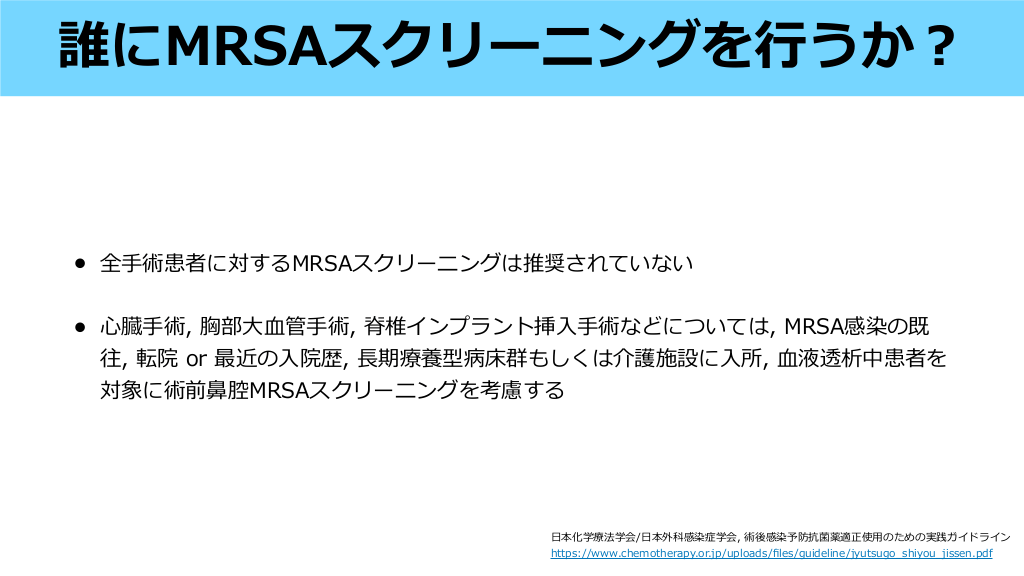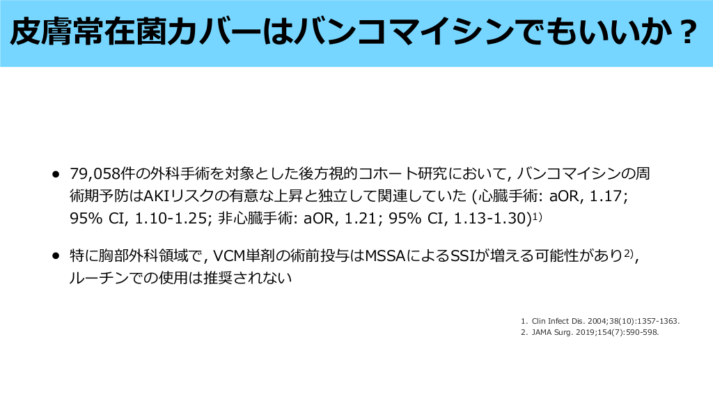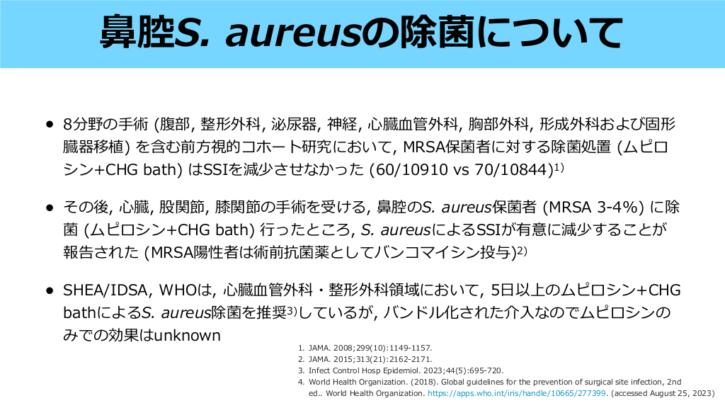 • 臓 管外科, 関節置換術, インプラント挿 術などを受ける患者で, MRSAの定着ま たは感染の既往があり根絶されていない場合, グリコペプチドを術前抗菌薬として投与す ることを検討する1-2) • 消化器外科領域では, MRSA保菌者に対する術前VCM投与の有効性は明らかではない3) , MRSA保菌者に対する関節形成術の術前抗菌薬にVCM+CEZを投与しても, CEZ単 剤と 較しSSI発 率を減らさないことがRCTで されており, 腔除菌などとのバンド ル化された取り組みでないならばVCM追加は効果が乏しい可能性がある4) • 臓 - 管外科領域の 部で, 以下の場合VCMとCEZの併 が推奨されている5) MRSA保菌, 3 以上の 院, 他施設からの転院, 既に抗菌薬投与がなされている場合, 1. J Antimicrob Chemother. 2006;57(4):589-608. 弁/ 管を挿 している場合 2. Am J Health Syst Pharm. 2013;70(3):195-283. 鼻 用 示 入 入 入 一 工 生 人 日 血 工 人 血 比 血 方 3. 本外科感染症学会 消化器外科SSI予防のための周術期管理ガイドライン2018 4. N Engl J Med 2023; 389:1488-1498 5. Ann Thorac Surg. 2007;83(4):1569-1576. 工 心 一 心 人 日 誰にバンコマイシンを投与するか? #32. • 8分野の 術 (腹部, 整形外科, 泌尿器, 神経, 臓 管外科, 胸部外科, 形成外科および固形 臓器移植) を含む前 視的コホート研究において, MRSA保菌者に対する除菌処置 (ムピロ シン+CHG bath) はSSIを減少させなかった (60/10910 vs 70/10844)1) • その後, 臓, 股関節, 膝関節の 術を受ける, 腔のS. aureus保菌者 (MRSA 3-4%) に除 菌 (ムピロシン+CHG bath) ったところ, S. aureusによるSSIが有意に減少することが 報告された (MRSA陽性者は術前抗菌薬としてバンコマイシン投与)2) • SHEA/IDSA, WHOは, 臓 管外科・整形外科領域において, 5 以上のムピロシン+CHG bathによるS. aureus除菌を推奨3)しているが, バンドル化された介 なのでムピロシンの みでの効果はunknown 入 日 血 JAMA. 2008;299(10):1149-1157. JAMA. 2015;313(21):2162-2171. Infect Control Hosp Epidemiol. 2023;44(5):695-720. World Health Organization. (2018). Global guidelines for the prevention of surgical site infection, 2nd ed.. World Health Organization. https://apps.who.int/iris/handle/10665/277399 . (accessed August 25, 2023) 鼻 心 手 行 血 心 方 手 1. 2. 3. 4. 心 鼻 腔S. aureusの除菌について #33. • CDCガイドラインでは, (Category IB)1) • WHOガイドラインでは, 術前に普通 鹸または抗菌 鹸のいずれかで 浴することを 推奨しており, CHG bathを推奨するエビデンスはないとしている (Conditional recommendation, moderate quality of evidence)2) • 本外科感染症学会も, CHG bathのみでSSIを予防する効果はないと結論づけている3) → 術前に 術前 に 鹸 or アルコール製剤による全 浴を推奨している 浴することはSSIを減らすことに有効であるが, アルコール製剤でなくともよい 入 身 石 石 石 日 手 手 1. JAMA Surg. 2017;152(8):784-791. 2. World Health Organization. (2018). Global guidelines for the prevention of surgical site infection, 2nd ed.. World Health Organization. https://apps.who.int/iris/handle/10665/277399 . (accessed August 25, 2023) 3. 本外科感染症学会 消化器外科SSI予防のための周術期管理ガイドライン2018 入 日 日 CHG bath #34.