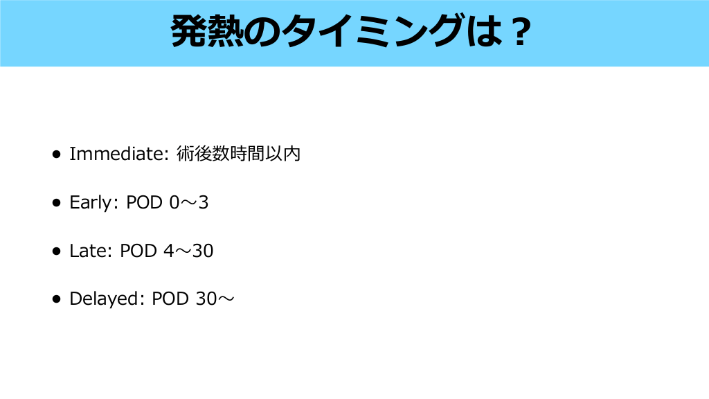 発熱のタイミングは? • Immediate: 術後数時間以内 • Early: POD 0〜3 • Late: POD 4〜30 • Delayed: POD 30〜 #4.