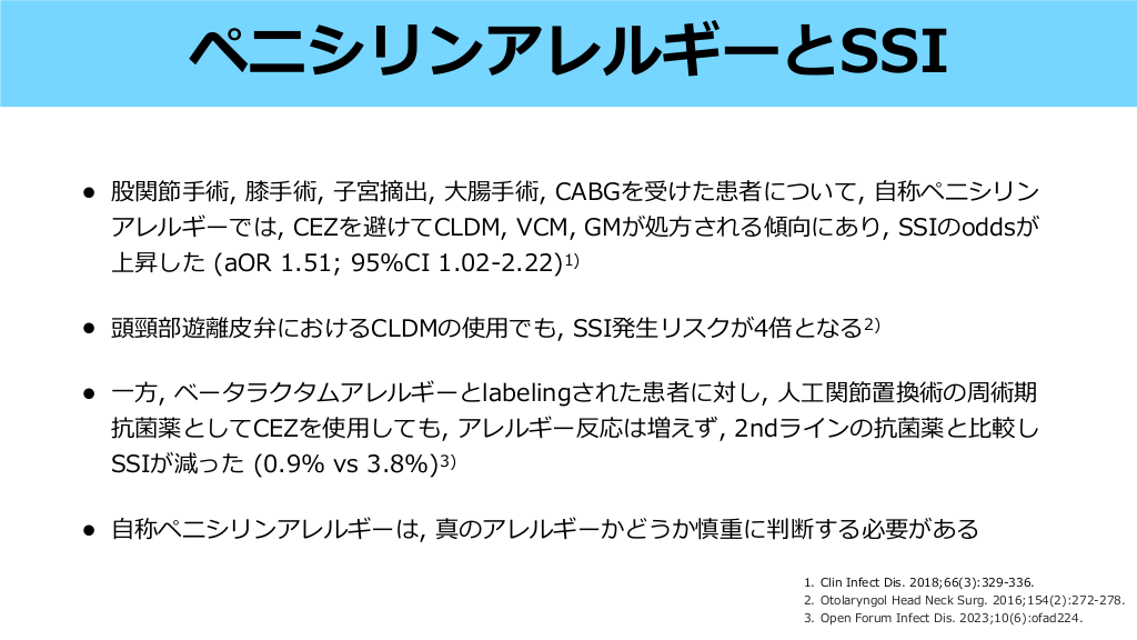 • 股関節 術, 膝 術, 宮摘出, 腸 術, CABGを受けた患者について, 称ペニシリン アレルギーでは, CEZを避けてCLDM, VCM, GMが処 される傾向にあり, SSIのoddsが 上昇した (aOR 1.51; 95%CI 1.02-2.22)1) • 頭頸部遊離 • , ベータラクタムアレルギーとlabelingされた患者に対し, 関節置換術の周術期 抗菌薬としてCEZを使 しても, アレルギー反応は増えず, 2ndラインの抗菌薬と 較し SSIが減った (0.9% vs 3.8%)3) • 弁におけるCLDMの使 でも, SSI発 リスクが4倍となる2) 称ペニシリンアレルギーは, 真のアレルギーかどうか慎重に判断する必要がある 比 自 工 人 方 生 手 用 大 用 子 手 皮 手 1. Clin Infect Dis. 2018;66(3):329-336. 2. Otolaryngol Head Neck Surg. 2016;154(2):272-278. 3. Open Forum Infect Dis. 2023;10(6):ofad224. 方 一 自 ペニシリンアレルギーとSSI 術後抗菌薬の使用と影響 #35.