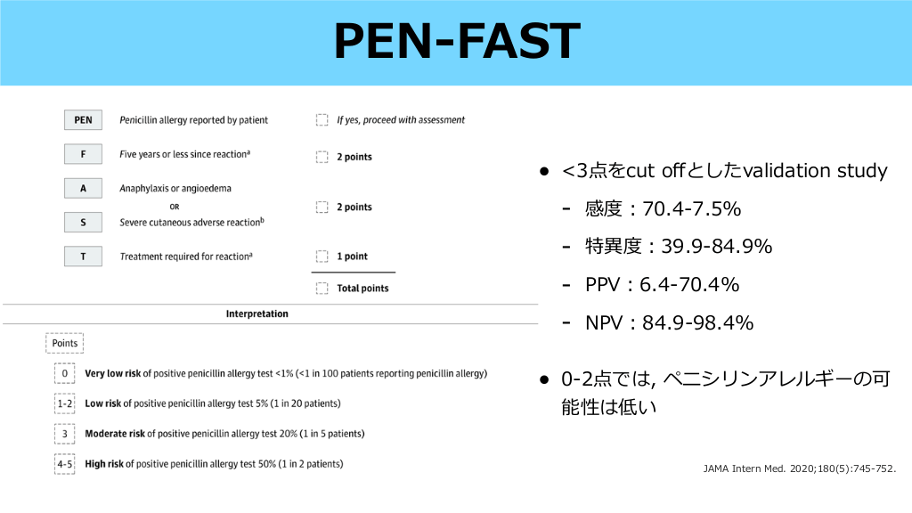 PEN-FAST • • <3点をcut o としたvalidation study - 感度:70.4-7.5% - 特異度:39.9-84.9% - PPV:6.4-70.4% - NPV:84.9-98.4% 0-2点では, ペニシリンアレルギーの可 能性は低い ff JAMA Intern Med. 2020;180(5):745-752. #36.