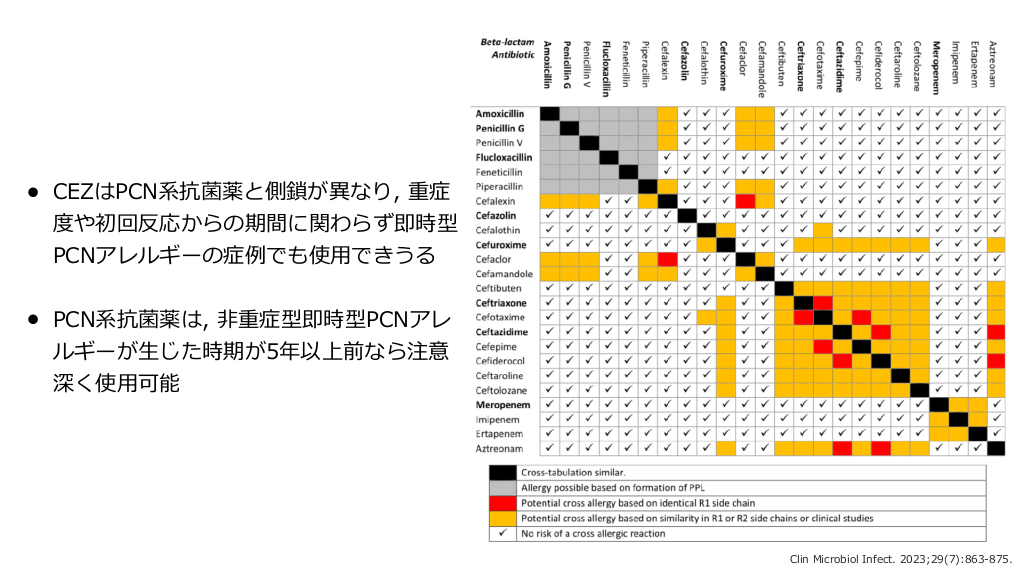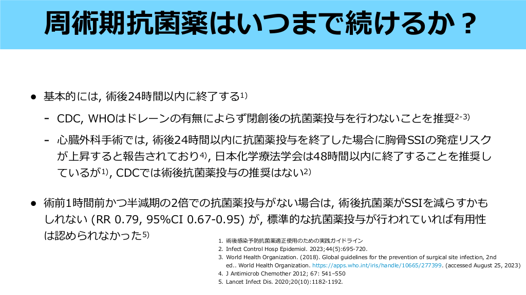 • CEZはPCN系抗菌薬と側鎖が異なり, 重症 度や初回反応からの期間に関わらず即時型 PCNアレルギーの症例でも使 できうる • PCN系抗菌薬は, 重症型即時型PCNアレ ルギーが じた時期が5年以上前なら注意 深く使 可能 用 非 生 用 Clin Microbiol Infect. 2023;29(7):863-875. #37. - CDC, WHOはドレーンの有無によらず閉創後の抗菌薬投与を わないことを推奨2-3) - 臓外科 術では, 術後24時間以内に抗菌薬投与を終了した場合に胸 SSIの発症リスク が上昇すると報告されており4), 本化学療法学会は48時間以内に終了することを推奨し ているが1), CDCでは術後抗菌薬投与の推奨はない2) 術前1時間前かつ半減期の2倍での抗菌薬投与がない場合は, 術後抗菌薬がSSIを減らすかも しれない (RR 0.79, 95%CI 0.67-0.95) が, 標準的な抗菌薬投与が われていれば有 性 は認められなかった5) 1. 術後感染予防抗菌薬適正使 のための実践ガイドライン 用 骨 行 行 2. Infect Control Hosp Epidemiol. 2023;44(5):695-720. 3. World Health Organization. (2018). Global guidelines for the prevention of surgical site infection, 2nd ed.. World Health Organization. https://apps.who.int/iris/handle/10665/277399 . (accessed August 25, 2023) 4. J Antimicrob Chemother 2012; 67: 541–550 5. Lancet Infect Dis. 2020;20(10):1182-1192. 日 • 基本的には, 術後24時間以内に終了する1) 用 • 手 心 周術期抗菌薬はいつまで続けるか? #38.