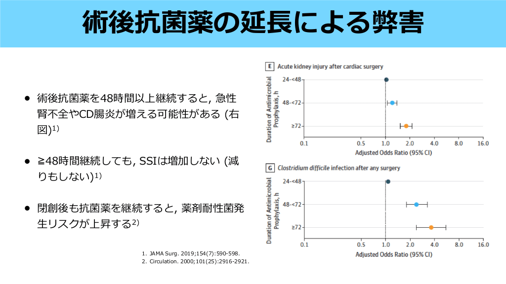 • 術後抗菌薬を48時間以上継続すると, 急性 腎不全やCD腸炎が増える可能性がある (右 図)1) • ≧48時間継続しても, SSIは増加しない (減 りもしない)1) • 閉創後も抗菌薬を継続すると, 薬剤耐性菌発 リスクが上昇する2) 1. JAMA Surg. 2019;154(7):590-598. 2. Circulation. 2000;101(25):2916-2921. 長 生 術後抗菌薬の延 による弊害 #39.