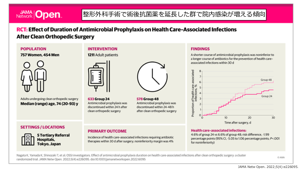 整形外科 術で術後抗菌薬を延 した群で院内感染が増える傾向 長 手 JAMA Netw Open. 2022;5(4):e226095. 予防のまとめと全体のまとめ #40.