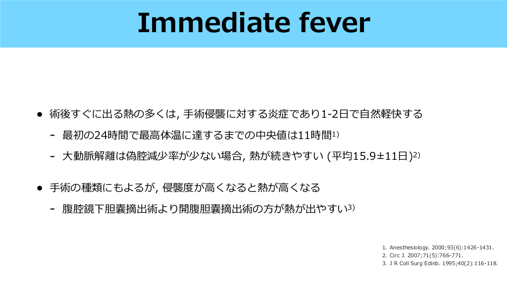 術後すぐに出る熱の多くは, 術の種類にもよるが, 侵襲度が くなると熱が 腹腔鏡下胆嚢摘出術より開腹胆嚢摘出術の )2) くなる が熱が出やすい3) 日 方 1. Anesthesiology. 2000;93(6):1426-1431. 2. Circ J. 2007;71(5):766-771. 3. J R Coll Surg Edinb. 1995;40(2):116-118. 高 - 然軽快する 動脈解離は偽腔減少率が少ない場合, 熱が続きやすい (平均15.9±11 自 • で 最初の24時間で最 体温に達するまでの中央値は11時間1) 日 - 術侵襲に対する炎症であり1-2 高 - 手 • 高 大 手 Immediate fever #5.