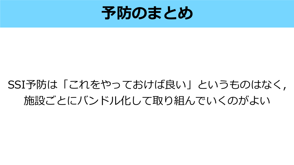 予防のまとめ SSI予防は「これをやっておけば良い」というものはなく, 施設ごとにバンドル化して取り組んでいくのがよい #41.