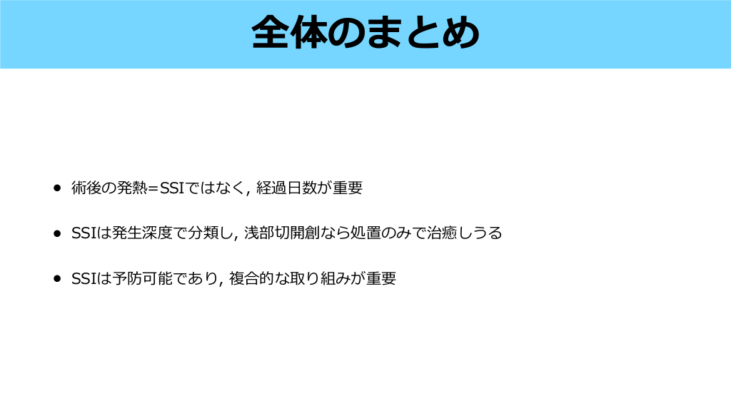 全体のまとめ • SSIは発 深度で分類し, 浅部切開創なら処置のみで治癒しうる • SSIは予防可能であり, 複合的な取り組みが重要 日 術後の発熱=SSIではなく, 経過 生 • 数が重要