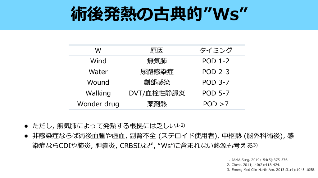 W 原因 タイミング Wind 無気肺 POD 1-2 Water 尿路感染症 POD 2-3 Wound 創部感染 POD 3-7 Walking Wonder drug • • DVT/ 栓性静脈炎 薬剤熱 POD 5-7 POD >7 ただし, 無気肺によって発熱する根拠には乏しい1-2) 感染症ならば術後 腫や虚 , 副腎不全 (ステロイド使 者), 中枢熱 (脳外科術後), 感 染症ならCDIや肺炎, 胆嚢炎, CRBSIなど, “Ws”に含まれない熱源も考える3) 1. JAMA Surg. 2019;154(5):375-376. 2. Chest. 2011;140(2):418-424. 用 血 血 3. Emerg Med Clin North Am. 2013;31(4):1045-1058. 血 非 術後発熱の古典的”Ws” #7.