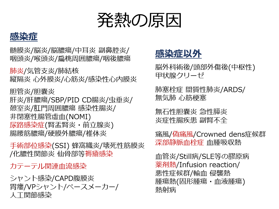 胆管炎/胆嚢炎肝炎/肝膿瘍/SBP/PID CD腸炎/虫垂炎/ 憩室炎/肛門周囲膿瘍 感染性腸炎/ 非閉塞性腸管虚血(NOMI) 尿路感染症(腎盂腎炎・前立腺炎) 腸腰筋膿瘍/硬膜外膿瘍/椎体炎