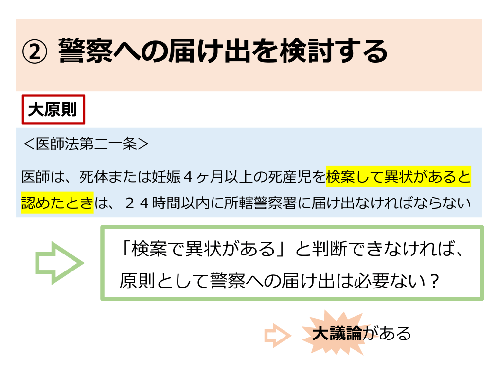 #10. ② 警察への届け出を検討する 大原則 <医師法第二一条> 医師は、死体または妊娠4ヶ月以上の死産児を検案して異状があると 認めたときは、24時間以内に所轄警察署に届け出なければならない 「検案で異状がある」と判断できなければ、 原則として警察への届け出は必要ない? 大議論がある