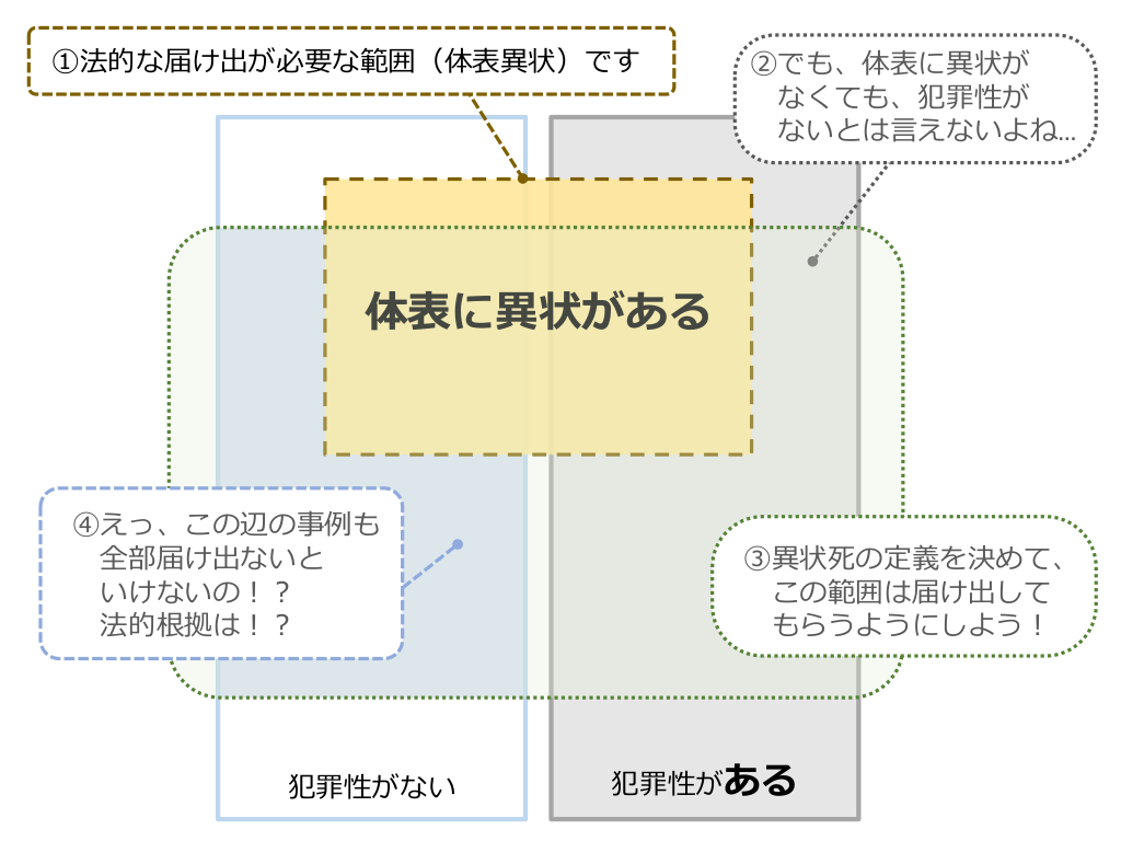#11. ①法的な届け出が必要な範囲(体表異状)です ②でも、体表に異状が なくても、犯罪性が ないとは言えないよね… 体表に異状がある ④えっ、この辺の事例も 全部届け出ないと いけないの!? 法的根拠は!? 犯罪性がない ③異状死の定義を決めて、 この範囲は届け出して もらうようにしよう! 犯罪性がある