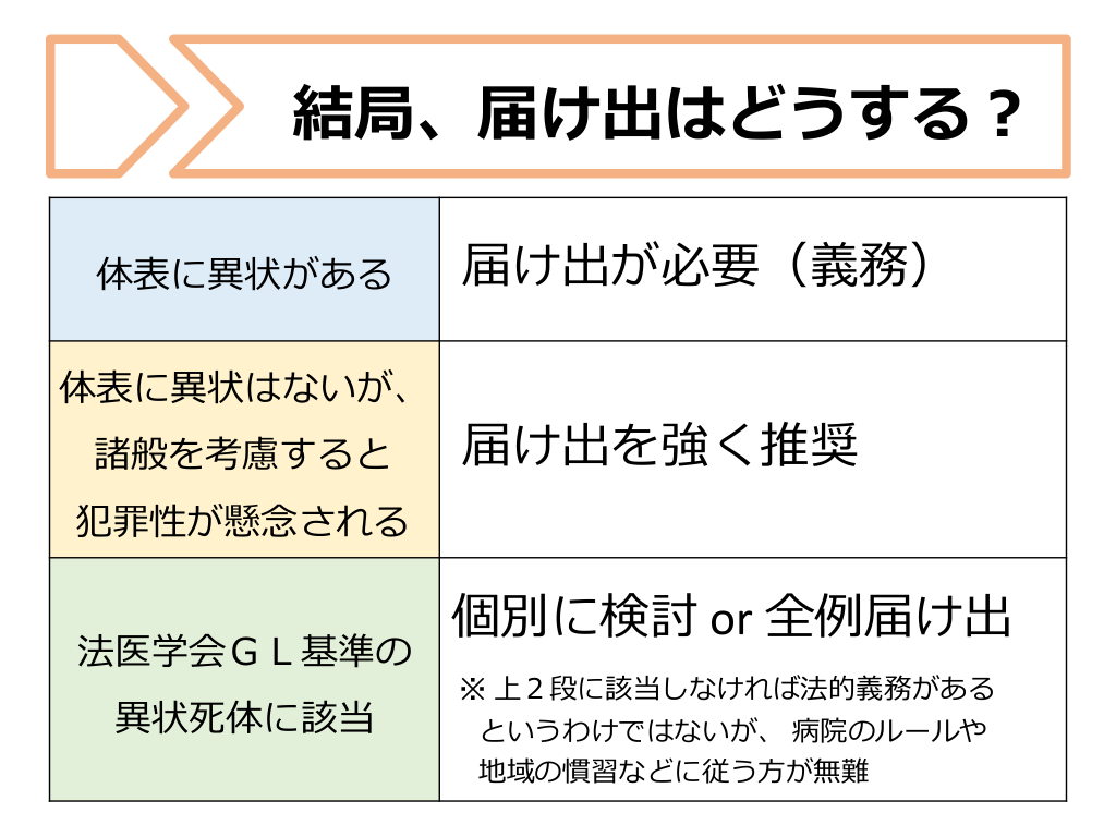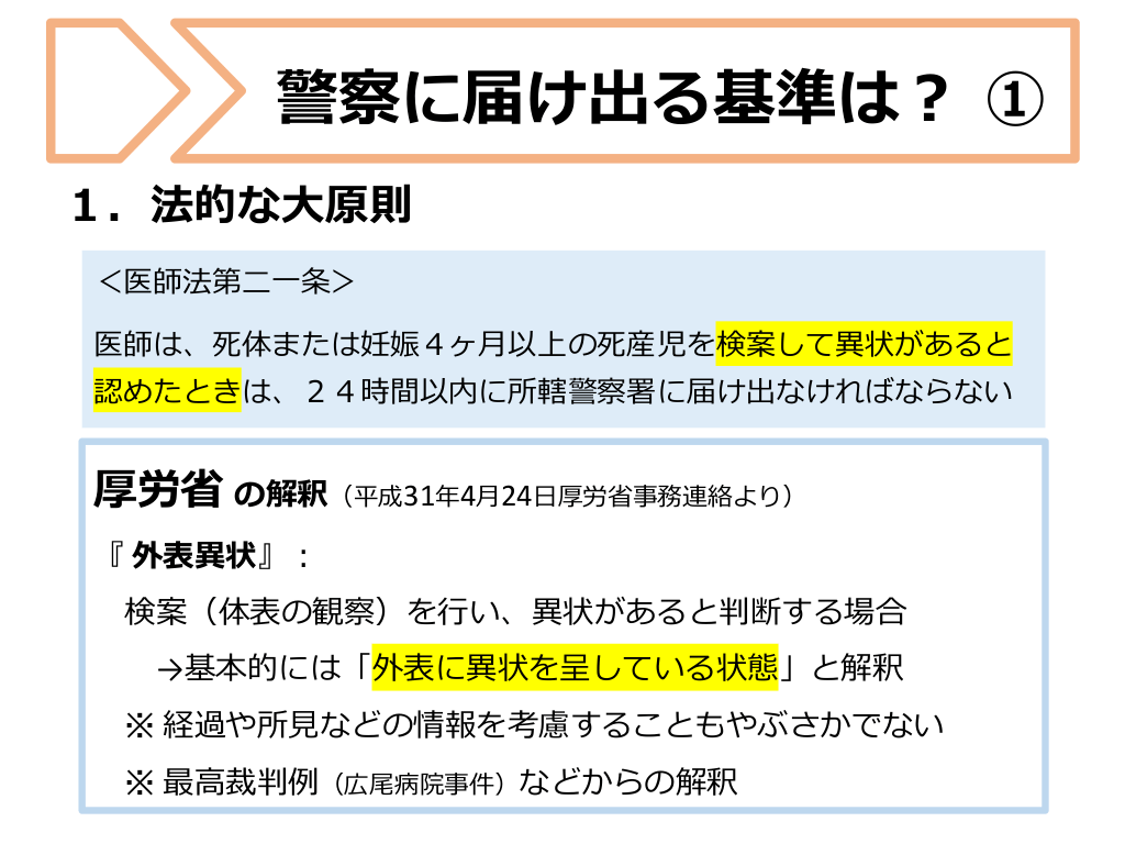 #12. 警察に届け出る基準は? ① 1.法的な大原則 <医師法第二一条> 医師は、死体または妊娠4ヶ月以上の死産児を検案して異状があると 認めたときは、24時間以内に所轄警察署に届け出なければならない 厚労省 の解釈(平成31年4月24日厚労省事務連絡より) 『 外表異状』: 検案(体表の観察)を行い、異状があると判断する場合 →基本的には「外表に異状を呈している状態」と解釈 ※ 経過や所見などの情報を考慮することもやぶさかでない ※ 最高裁判例(広尾病院事件)などからの解釈