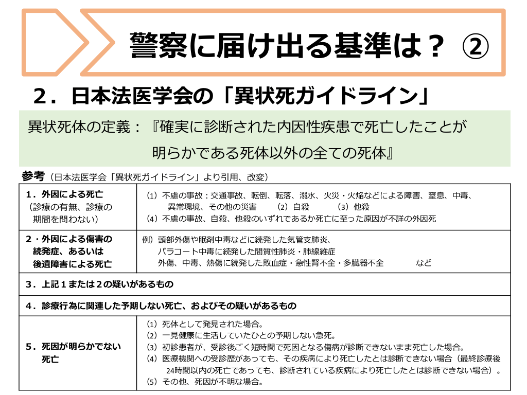 #13. 警察に届け出る基準は? ② 2.日本法医学会の「異状死ガイドライン」 異状死体の定義:『確実に診断された内因性疾患で死亡したことが 明らかである死体以外の全ての死体』 参考(日本法医学会「異状死ガイドライン」より引用、改変) 1.外因による死亡 (診療の有無、診療の 期間を問わない) (1)不慮の事故:交通事故、転倒、転落、溺水、火災・火焔などによる障害、窒息、中毒、 異常環境、その他の災害 (2)自殺 (3)他殺 (4)不慮の事故、自殺、他殺のいずれであるか死亡に至った原因が不詳の外因死 2・外因による傷害の 続発症、あるいは 後遺障害による死亡 例)頭部外傷や眠剤中毒などに続発した気管支肺炎、 パラコート中毒に続発した間質性肺炎・肺線維症 外傷、中毒、熱傷に続発した敗血症・急性腎不全・多臓器不全 など 3.上記1または2の疑いがあるもの 4.診療行為に関連した予期しない死亡、およびその疑いがあるもの 5.死因が明らかでない 死亡 (1)死体として発見された場合。 (2)一見健康に生活していたひとの予期しない急死。 (3)初診患者が、受診後ごく短時間で死因となる傷病が診断できないまま死亡した場合。 (4)医療機関への受診歴があっても、その疾病により死亡したとは診断できない場合(最終診療後 24時間以内の死亡であっても、診断されている疾病により死亡したとは診断できない場合)。 (5)その他、死因が不明な場合。