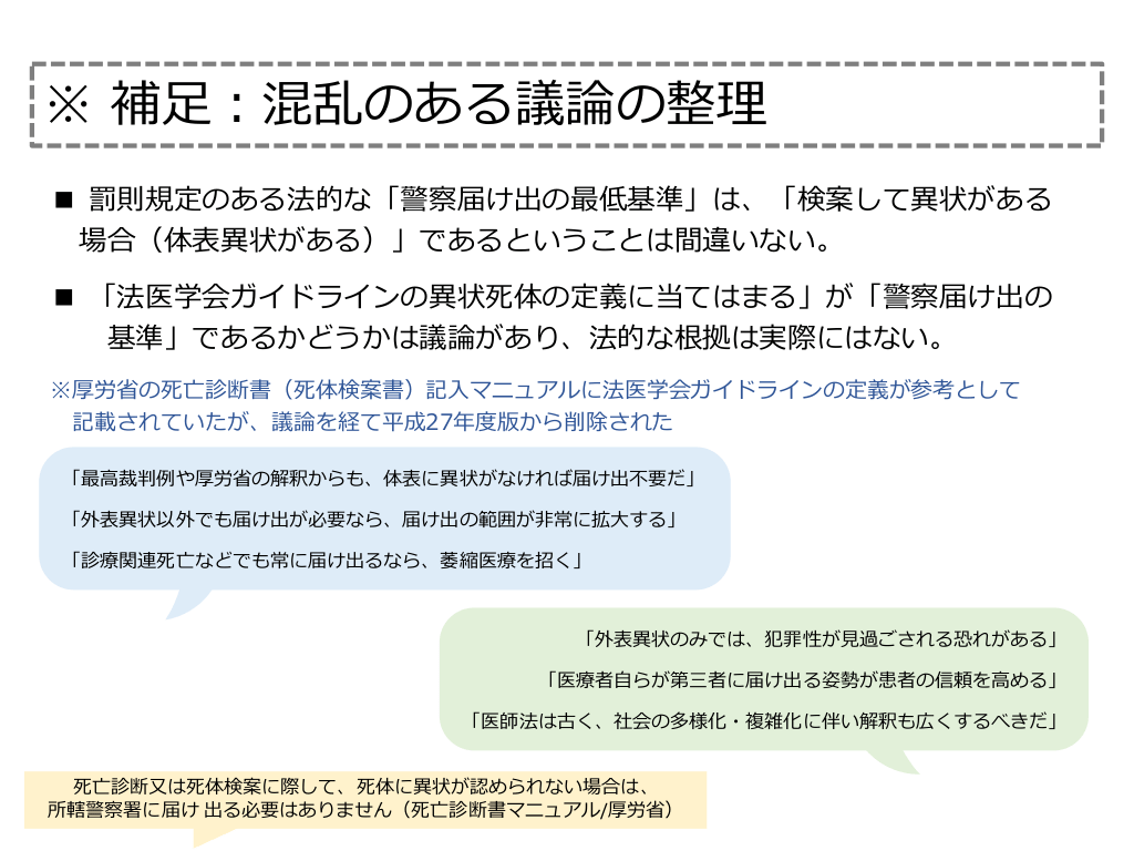 #14. ※ 補足:混乱のある議論の整理 ■ 罰則規定のある法的な「警察届け出の最低基準」は、「検案して異状がある 場合(体表異状がある)」であるということは間違いない。 ■ 「法医学会ガイドラインの異状死体の定義に当てはまる」が「警察届け出の 基準」であるかどうかは議論があり、法的な根拠は実際にはない。 ※厚労省の死亡診断書(死体検案書)記入マニュアルに法医学会ガイドラインの定義が参考として 記載されていたが、議論を経て平成27年度版から削除された 「最高裁判例や厚労省の解釈からも、体表に異状がなければ届け出不要だ」 「外表異状以外でも届け出が必要なら、届け出の範囲が非常に拡大する」 「診療関連死亡などでも常に届け出るなら、萎縮医療を招く」 「外表異状のみでは、犯罪性が見過ごされる恐れがある」 「医療者自らが第三者に届け出る姿勢が患者の信頼を高める」 「医師法は古く、社会の多様化・複雑化に伴い解釈も広くするべきだ」 死亡診断又は死体検案に際して、死体に異状が認められない場合は、 所轄警察署に届け 出る必要はありません(死亡診断書マニュアル/厚労省)