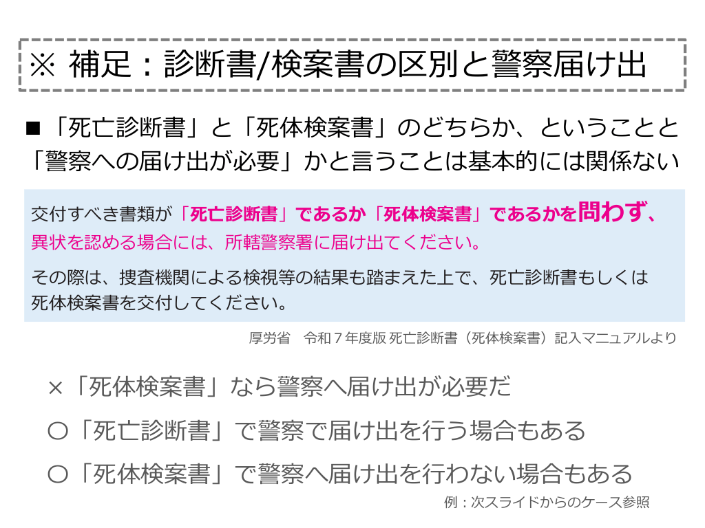 #16. ※ 補足:診断書/検案書の区別と警察届け出 ■「死亡診断書」と「死体検案書」のどちらか、ということと 「警察への届け出が必要」かと言うことは基本的には関係ない 交付すべき書類が「死亡診断書」であるか「死体検案書」であるかを問わず、 異状を認める場合には、所轄警察署に届け出てください。 その際は、捜査機関による検視等の結果も踏まえた上で、死亡診断書もしくは 死体検案書を交付してください。 厚労省 令和7年度版 死亡診断書(死体検案書)記入マニュアルより ×「死体検案書」なら警察へ届け出が必要だ 〇「死亡診断書」で警察で届け出を行う場合もある 〇「死体検案書」で警察へ届け出を行わない場合もある 例:次スライドからのケース参照