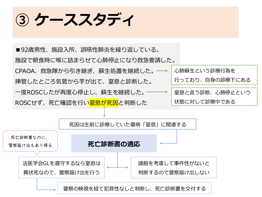 #17. ③ ケーススタディ ■92歳男性、施設入所、誤嚥性肺炎を繰り返している。 施設で朝食時に喉に詰まらせて心肺停止になり救急要請した。 CPAOA、救急隊から引き継ぎ、蘇生処置を継続した。 心肺蘇生という診療行為を 挿管したところ気管から芋が出て、窒息と診断した。 行っており、自身の診療下にある 一度ROSCしたが再度心停止し、蘇生を継続した。 窒息と言う診断、心肺停止という ROSCせず、死亡確認を行い窒息が死因と判断した 状態に対して診療中である 死因は生前に診療していた傷病「窒息」に関連する 死亡診断書なのに、 警察届け出もあり得る 死亡診断書の適応 法医学会GLを遵守するなら窒息は 諸般を考慮して事件性がないと 異状死なので、警察届け出を行う 判断するので警察届け出しない 警察の検視を経て犯罪性なしと判断し、死亡診断書を交付する