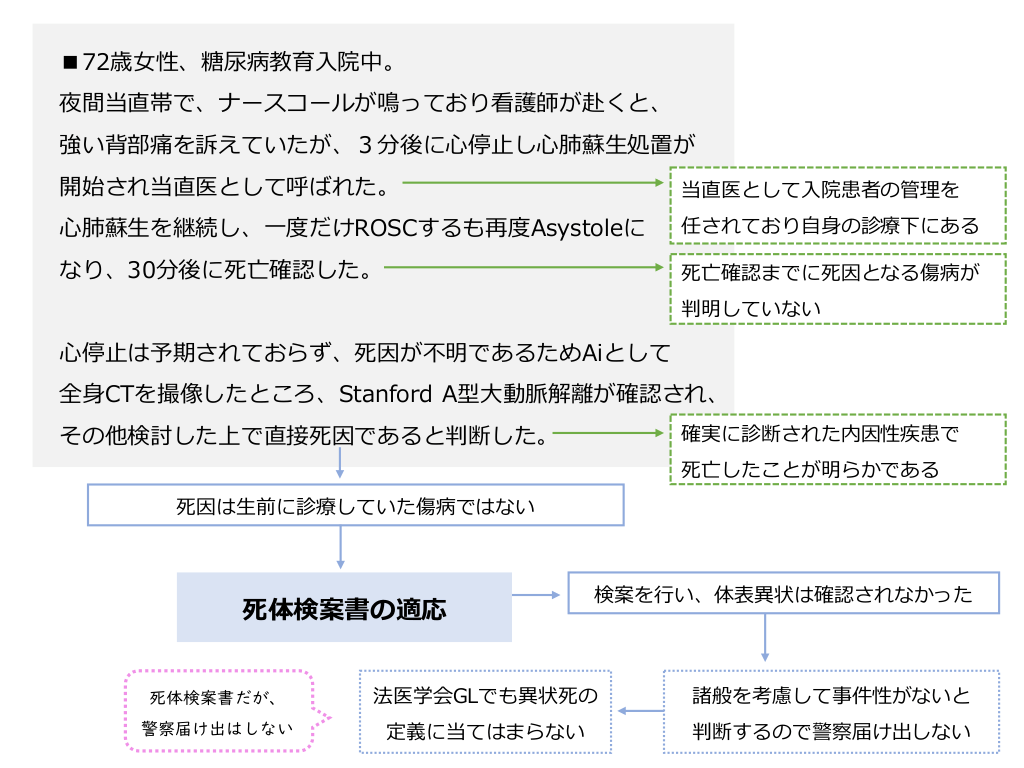 #18. ■72歳女性、糖尿病教育入院中。 夜間当直帯で、ナースコールが鳴っており看護師が赴くと、 強い背部痛を訴えていたが、3分後に心停止し心肺蘇生処置が 開始され当直医として呼ばれた。 当直医として入院患者の管理を 心肺蘇生を継続し、一度だけROSCするも再度Asystoleに 任されており自身の診療下にある なり、30分後に死亡確認した。 死亡確認までに死因となる傷病が 判明していない 心停止は予期されておらず、死因が不明であるためAiとして 全身CTを撮像したところ、Stanford A型大動脈解離が確認され、 確実に診断された内因性疾患で その他検討した上で直接死因であると判断した。 死亡したことが明らかである 死因は生前に診療していた傷病ではない 死体検案書の適応 検案を行い、体表異状は確認されなかった 死体検案書だが、 法医学会GLでも異状死の 諸般を考慮して事件性がないと 警察届け出はしない 定義に当てはまらない 判断するので警察届け出しない