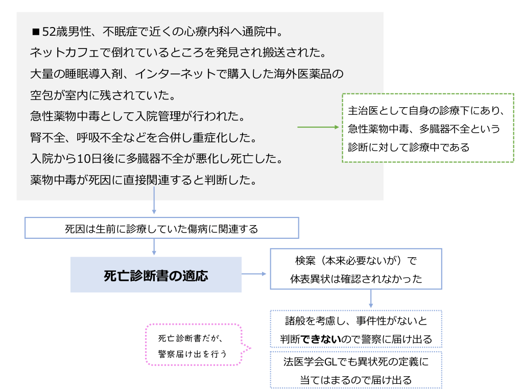 #19. ■52歳男性、不眠症で近くの心療内科へ通院中。 ネットカフェで倒れているところを発見され搬送された。 大量の睡眠導入剤、インターネットで購入した海外医薬品の 空包が室内に残されていた。 主治医として自身の診療下にあり、 急性薬物中毒として入院管理が行われた。 急性薬物中毒、多臓器不全という 腎不全、呼吸不全などを合併し重症化した。 入院から10日後に多臓器不全が悪化し死亡した。 診断に対して診療中である 薬物中毒が死因に直接関連すると判断した。 死因は生前に診療していた傷病に関連する 死亡診断書の適応 検案(本来必要ないが)で 体表異状は確認されなかった 諸般を考慮し、事件性がないと 死亡診断書だが、 警察届け出を行う 判断できないので警察に届け出る 法医学会GLでも異状死の定義に 当てはまるので届け出る