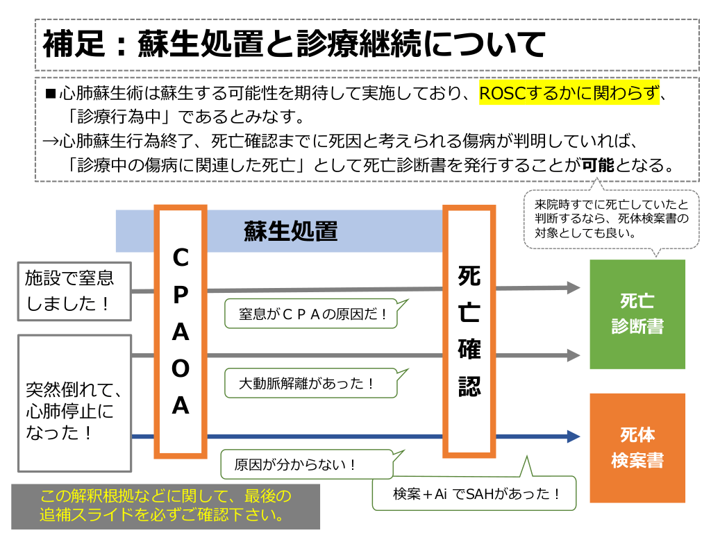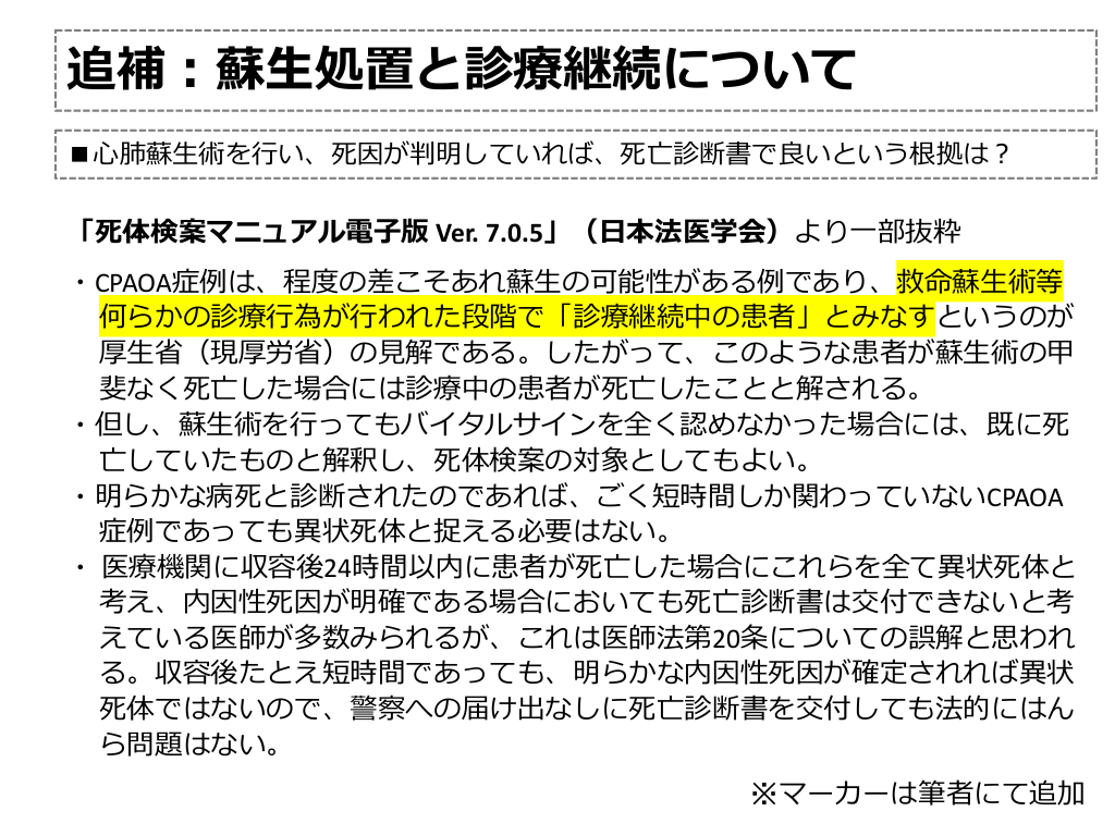 #20. 追補:蘇生処置と診療継続について ■心肺蘇生術を行い、死因が判明していれば、死亡診断書で良いという根拠は? 「死体検案マニュアル電子版 Ver. 7.0.5」(日本法医学会)より一部抜粋 ・CPAOA症例は、程度の差こそあれ蘇生の可能性がある例であり、救命蘇生術等 何らかの診療行為が行われた段階で「診療継続中の患者」とみなすというのが 厚生省(現厚労省)の見解である。したがって、このような患者が蘇生術の甲 斐なく死亡した場合には診療中の患者が死亡したことと解される。 ・但し、蘇生術を行ってもバイタルサインを全く認めなかった場合には、既に死 亡していたものと解釈し、死体検案の対象としてもよい。 ・明らかな病死と診断されたのであれば、ごく短時間しか関わっていないCPAOA 症例であっても異状死体と捉える必要はない。 ・ 医療機関に収容後24時間以内に患者が死亡した場合にこれらを全て異状死体と 考え、内因性死因が明確である場合においても死亡診断書は交付できないと考 えている医師が多数みられるが、これは医師法第20条についての誤解と思われ る。収容後たとえ短時間であっても、明らかな内因性死因が確定されれば異状 死体ではないので、警察への届け出なしに死亡診断書を交付しても法的にはん ら問題はない。 ※マーカーは筆者にて追加