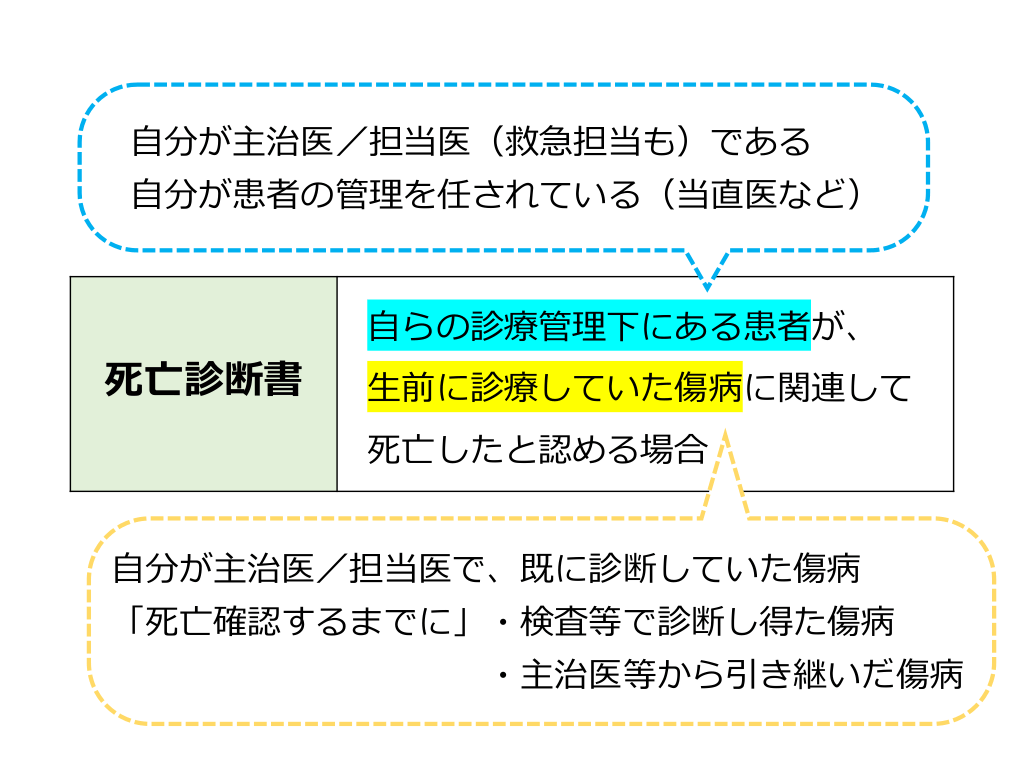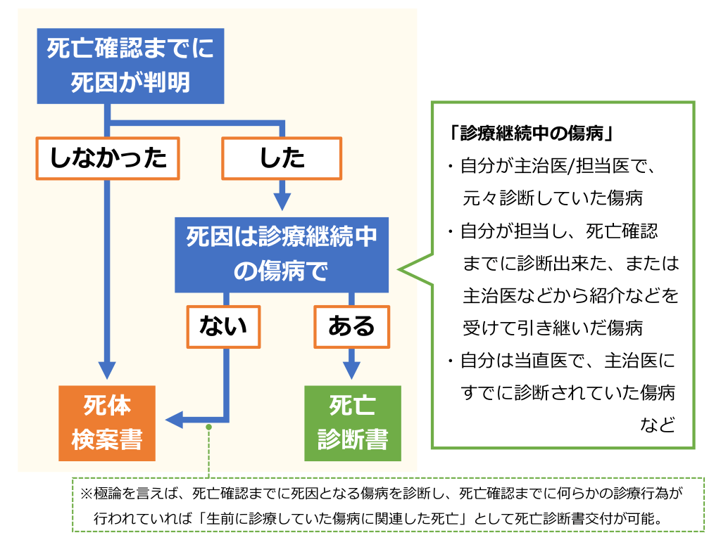 #5. 死亡確認までに 死因が判明 しなかった 「診療継続中の傷病」 した ・自分が主治医/担当医で、 元々診断していた傷病 死因は診療継続中 の傷病で ない ある ・自分が担当し、死亡確認 までに診断出来た、または 主治医などから紹介などを 受けて引き継いだ傷病 ・自分は当直医で、主治医に 死体 検案書 死亡 診断書 すでに診断されていた傷病 など ※極論を言えば、死亡確認までに死因となる傷病を診断し、死亡確認までに何らかの診療行為が 行われていれば「生前に診療していた傷病に関連した死亡」として死亡診断書交付が可能。