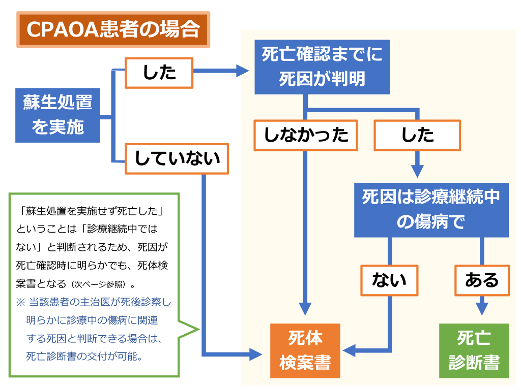 #6. CPAOA患者の場合 した 蘇生処置 を実施 していない 死亡確認までに 死因が判明 しなかった した 死因は診療継続中 の傷病で 「蘇生処置を実施せず死亡した」 ということは「診療継続中では ない」と判断されるため、死因が 死亡確認時に明らかでも、死体検 ない 案書となる(次ページ参照)。 ある ※ 当該患者の主治医が死後診察し 明らかに診療中の傷病に関連 する死因と判断できる場合は、 死亡診断書の交付が可能。 死体 検案書 死亡 診断書