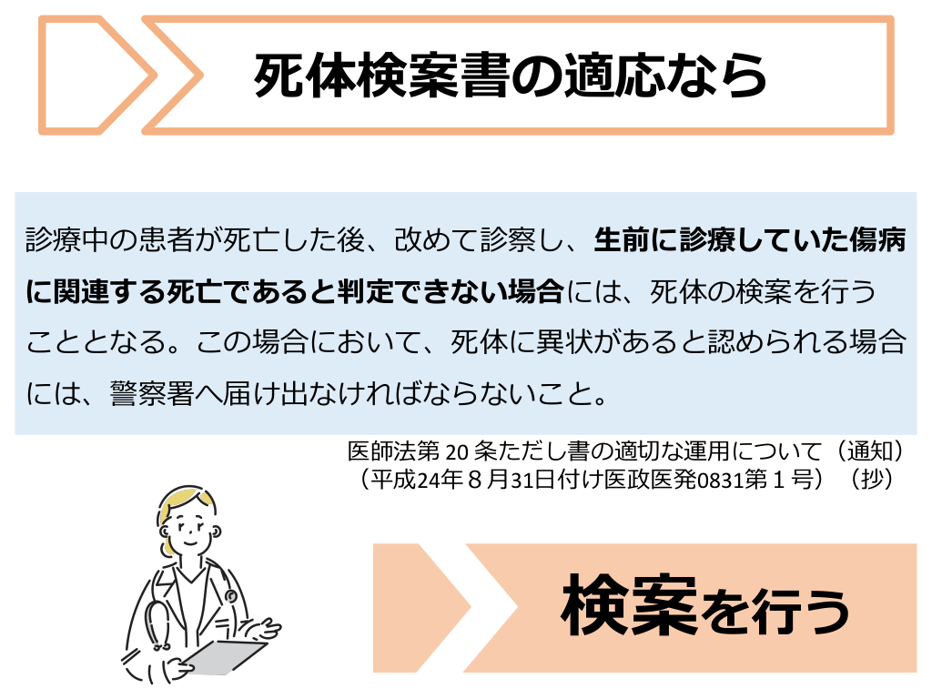 #8. 死体検案書の適応なら 診療中の患者が死亡した後、改めて診察し、生前に診療していた傷病 に関連する死亡であると判定できない場合には、死体の検案を行う こととなる。この場合において、死体に異状があると認められる場合 には、警察署へ届け出なければならないこと。 医師法第 20 条ただし書の適切な運用について(通知) (平成24年8月31日付け医政医発0831第1号)(抄) 検案を行う