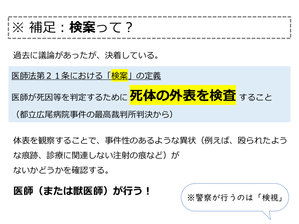 #9. ※ 補足:検案って? 過去に議論があったが、決着している。 医師法第21条における「検案」の定義 医師が死因等を判定するために 死体の外表を検査 すること (都立広尾病院事件の最高裁判所判決から) 体表を観察することで、事件性のあるような異状(例えば、殴られたよう な痕跡、診療に関連しない注射の痕など)が ないかどうかを確認する。 医師(または獣医師)が行う! ※警察が行うのは「検視」