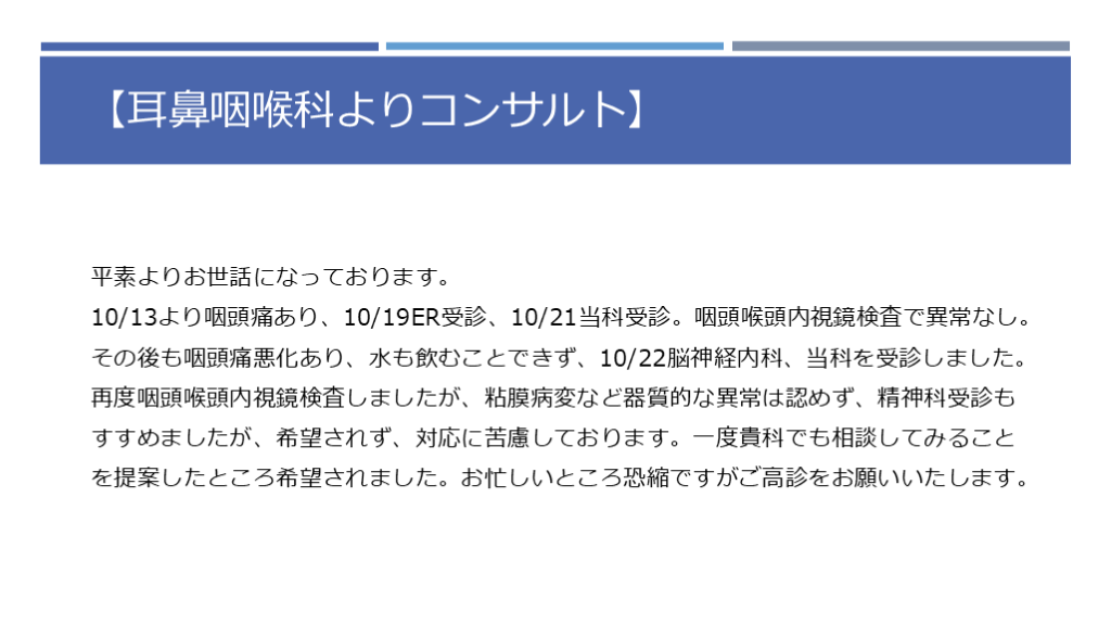 10/13より咽頭痛あり、10/19ER受診、10/21当科受診。咽頭喉頭内視鏡検査で異常なし。
