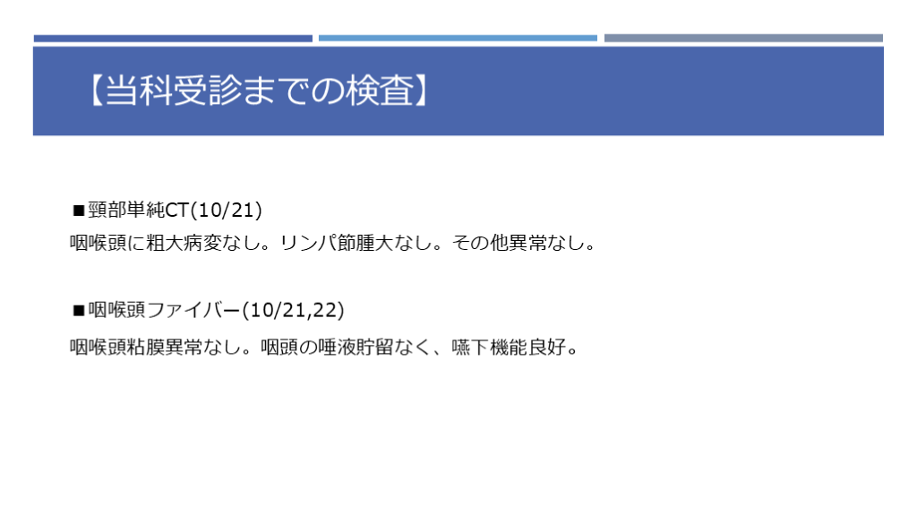 咽喉頭粘膜異常なし。咽頭の唾液貯留なく、嚥下機能良好。 【当科受診までの検査】