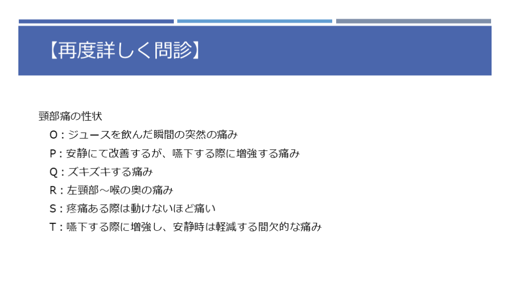 T:嚥下する際に増強し、安静時は軽減する間欠的な痛み 【再度詳しく問診】