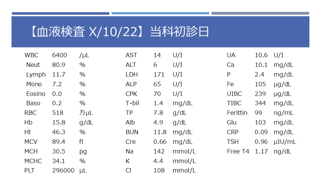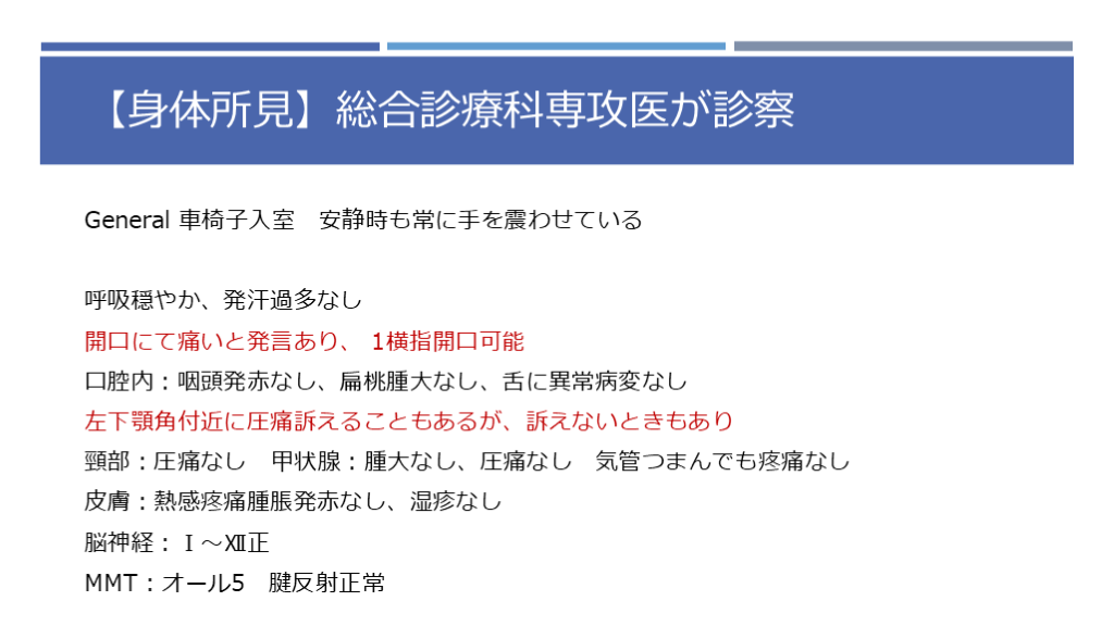 MMT:オール5 腱反射正常 【身体所見】総合診療科専攻医が診察