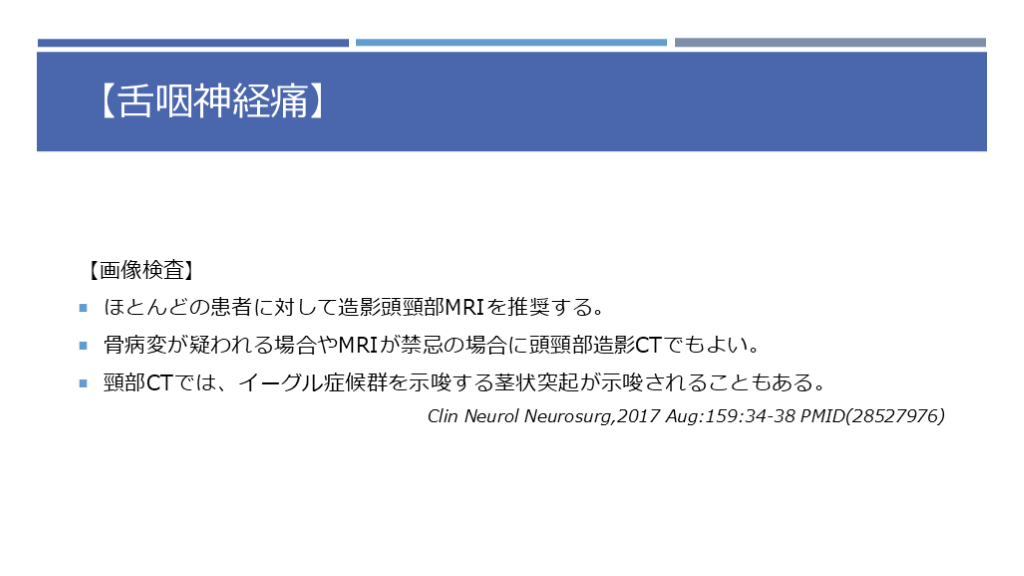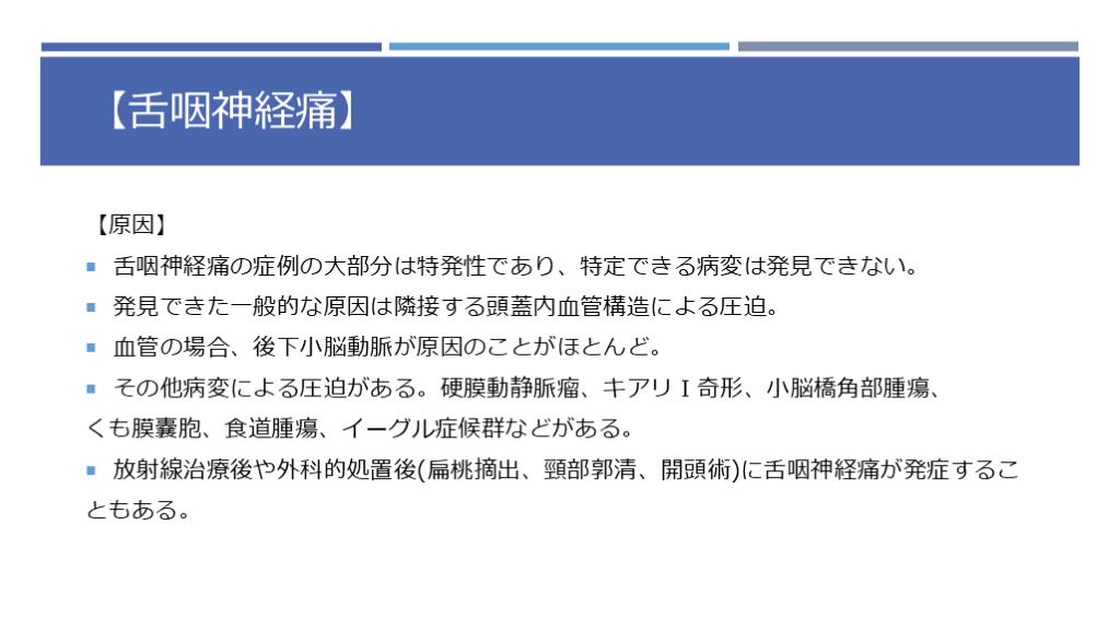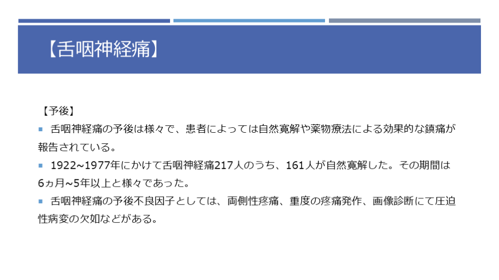 舌咽神経痛の予後不良因子としては、両側性疼痛、重度の疼痛発作、画像診断にて圧迫
