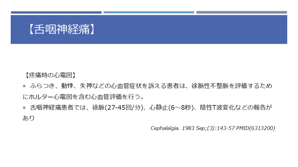 舌咽神経痛患者では、徐脈(27-45回/分)、心静止(6~8秒)、陰性T波変化などの報告が