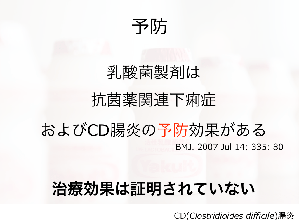 #101. 予防 乳酸菌製剤は 抗菌薬関連下痢症 およびCD腸炎の予防効果がある BMJ. 2007 Jul 14; 335: 80 治療効果は証明されていない CD(Clostridioides difficile)腸炎