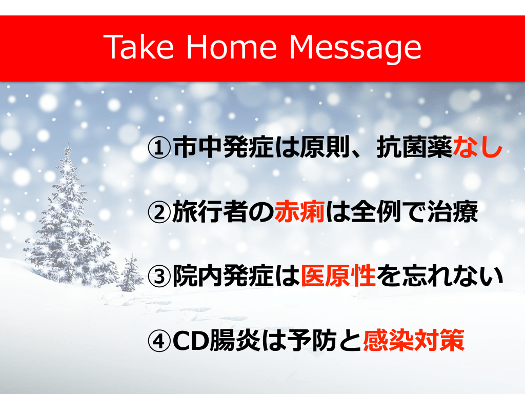 #104. Take Home Message ①市中発症は原則、抗菌薬なし ②旅⾏者の⾚痢は全例で治療 ③院内発症は医原性を忘れない ④CD腸炎は予防と感染対策